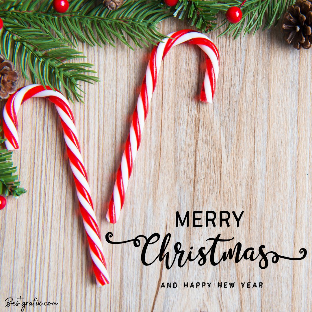 This Merry Christmas message image features festive candy canes paired with charming Christmas tree decorations. The design is completed with a warm Merry Christmas and Happy New Year message, creating a cheerful and inviting holiday greeting perfect for sharing seasonal joy