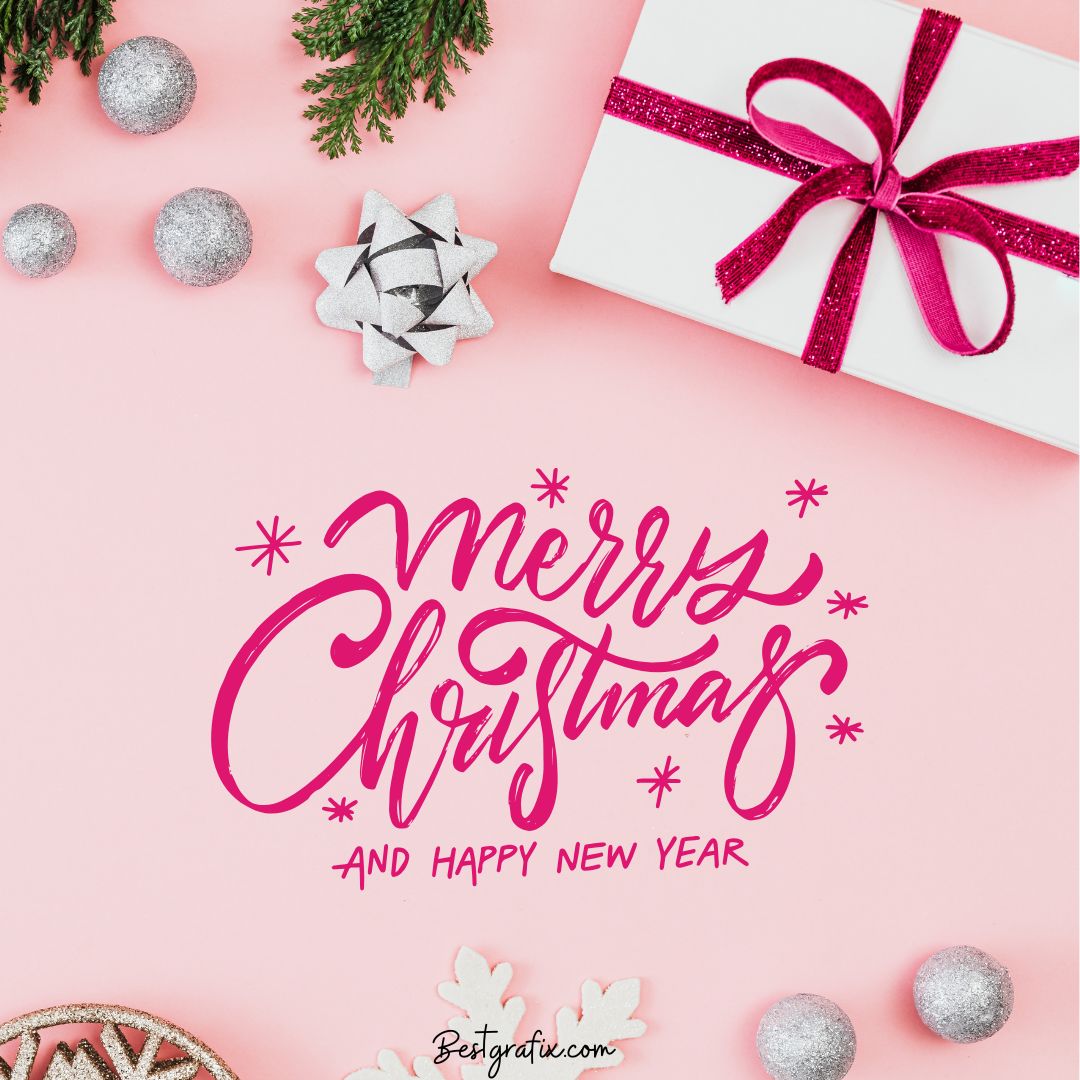This Merry Christmas wishes image features Merry Christmas and Happy New Year written in a stylish, elegant font. The festive background filled with Christmas decorations adds warmth and charm, creating a joyful and vibrant holiday greeting perfect for sharing with loved ones