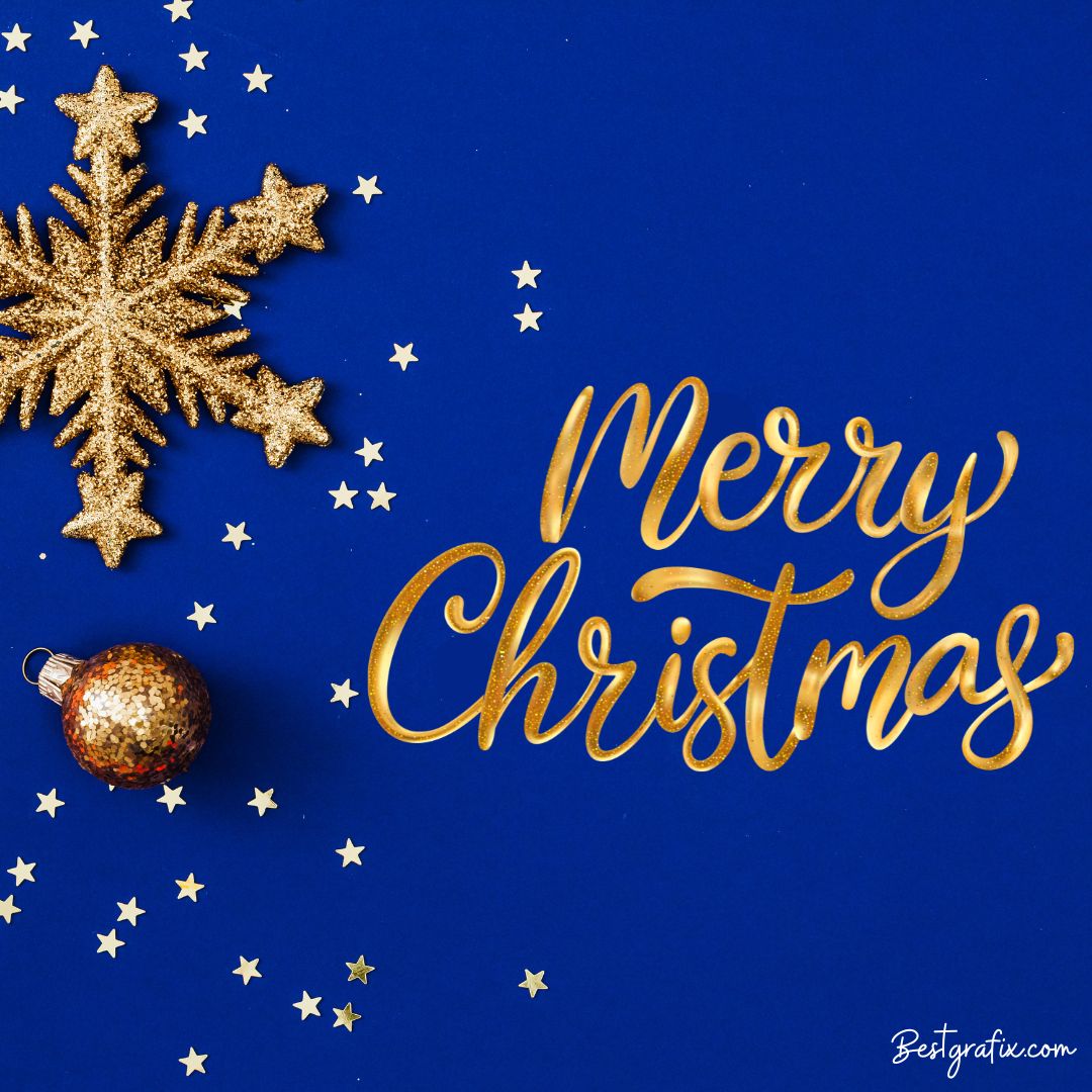 This Merry Christmas wishes image features Merry Christmas written in elegant golden text, beautifully complemented by golden snowflakes and stars. Set against a rich blue background, the design creates a striking and festive look, perfect for celebrating the holiday season with warmth and cheer.