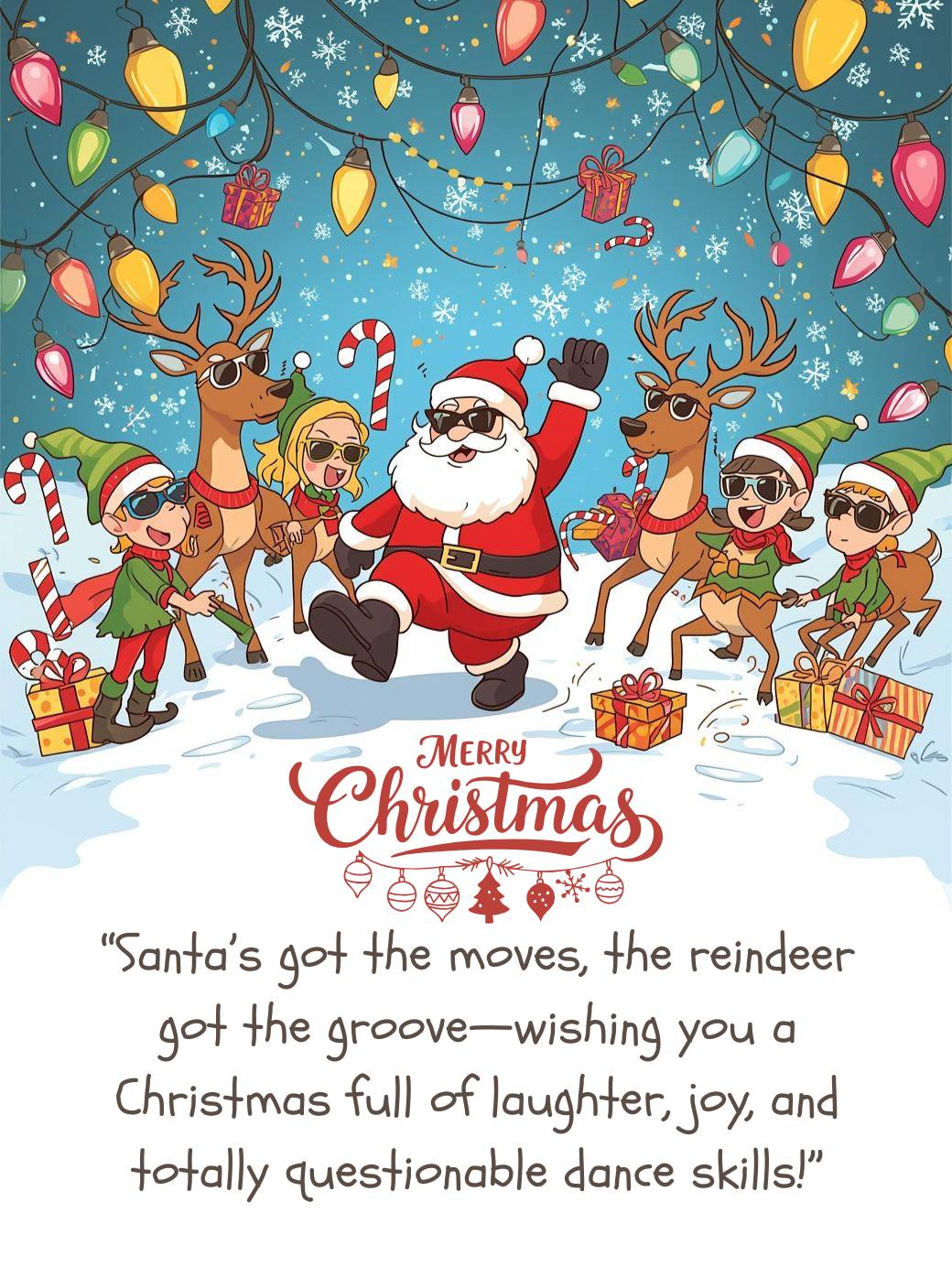 “Santa’s got the moves, the reindeer got the groove—wishing you a Christmas full of laughter, joy, and totally questionable dance skills!”