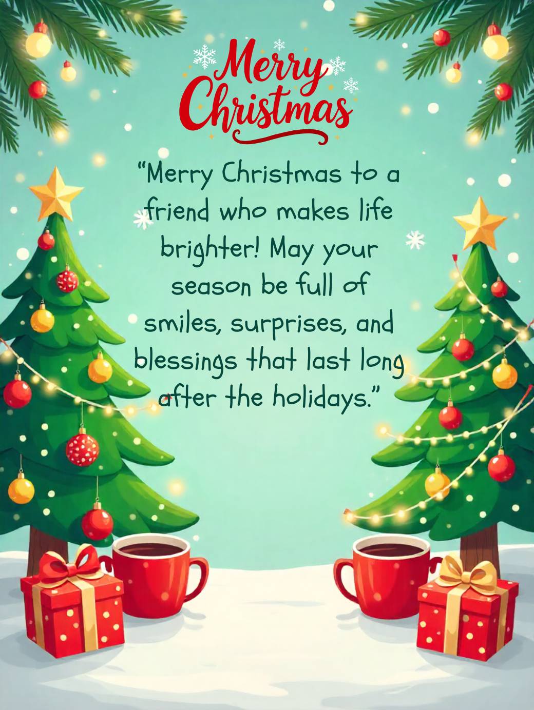 “Merry Christmas to a friend who makes life brighter! May your season be full of smiles, surprises, and blessings that last long after the holidays.”