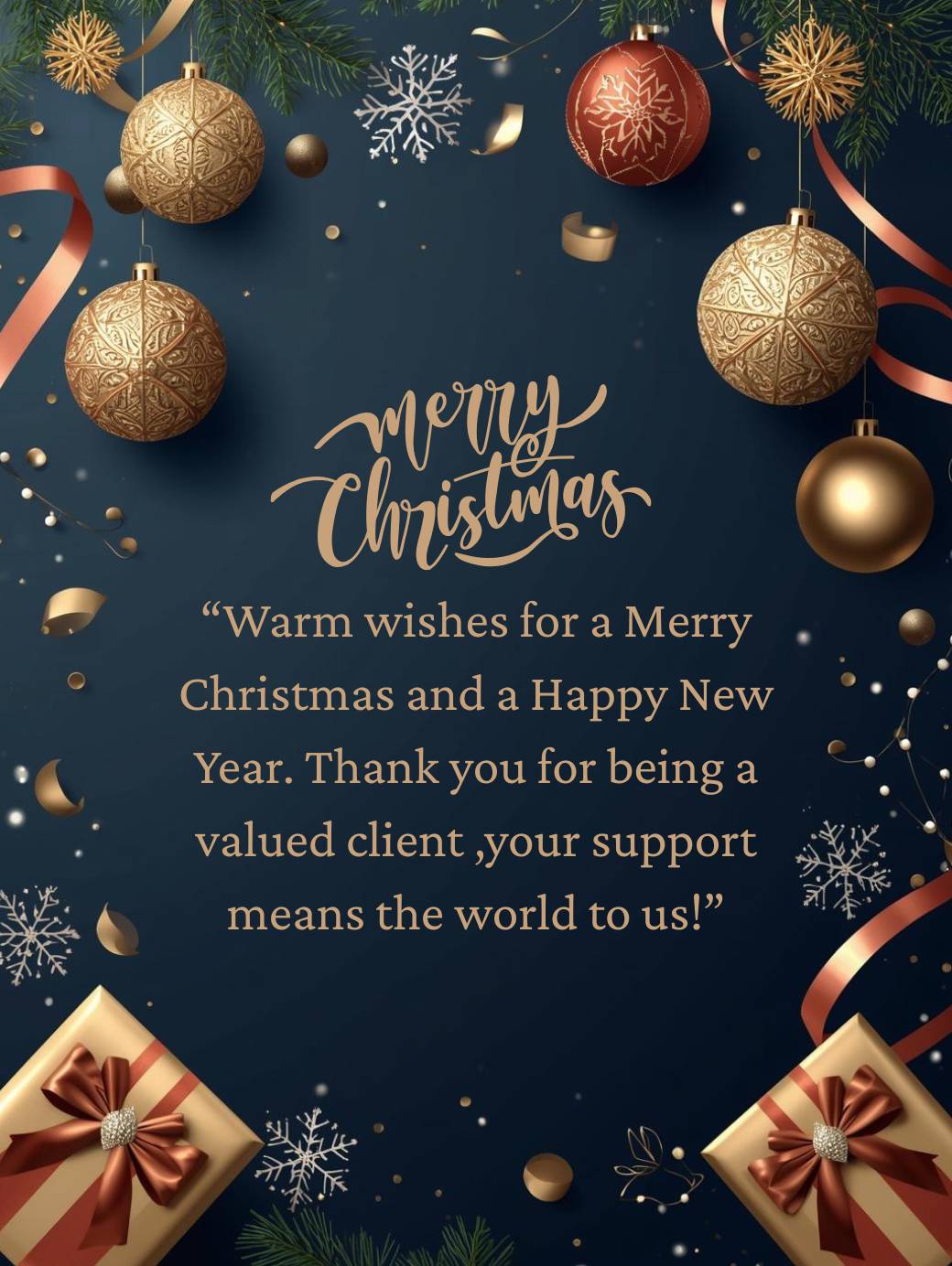 Christmas wishes for clients and customers are professional yet warm messages crafted to show appreciation and strengthen business relationships. These greetings convey gratitude for their trust and support while spreading festive cheer. Whether sent via email, cards, or social media, such messages help maintain positive connections and leave a lasting impression, combining professionalism with the joy and warmth of the holiday season.