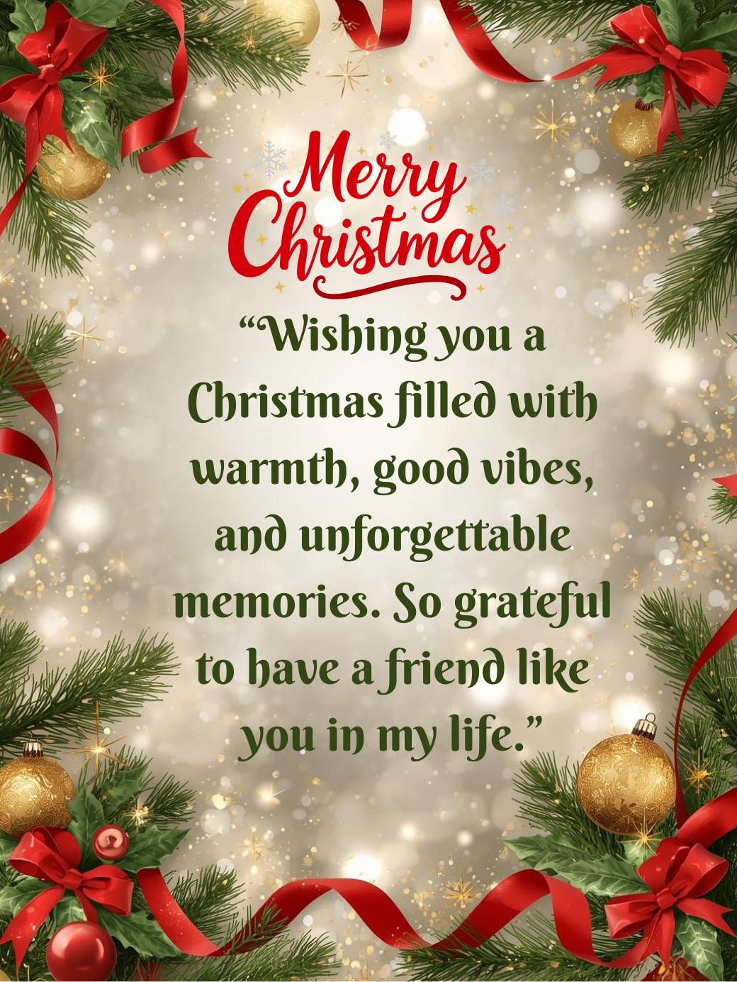 “Wishing you a Christmas filled with warmth, good vibes, and unforgettable memories. So grateful to have a friend like you in my life.”