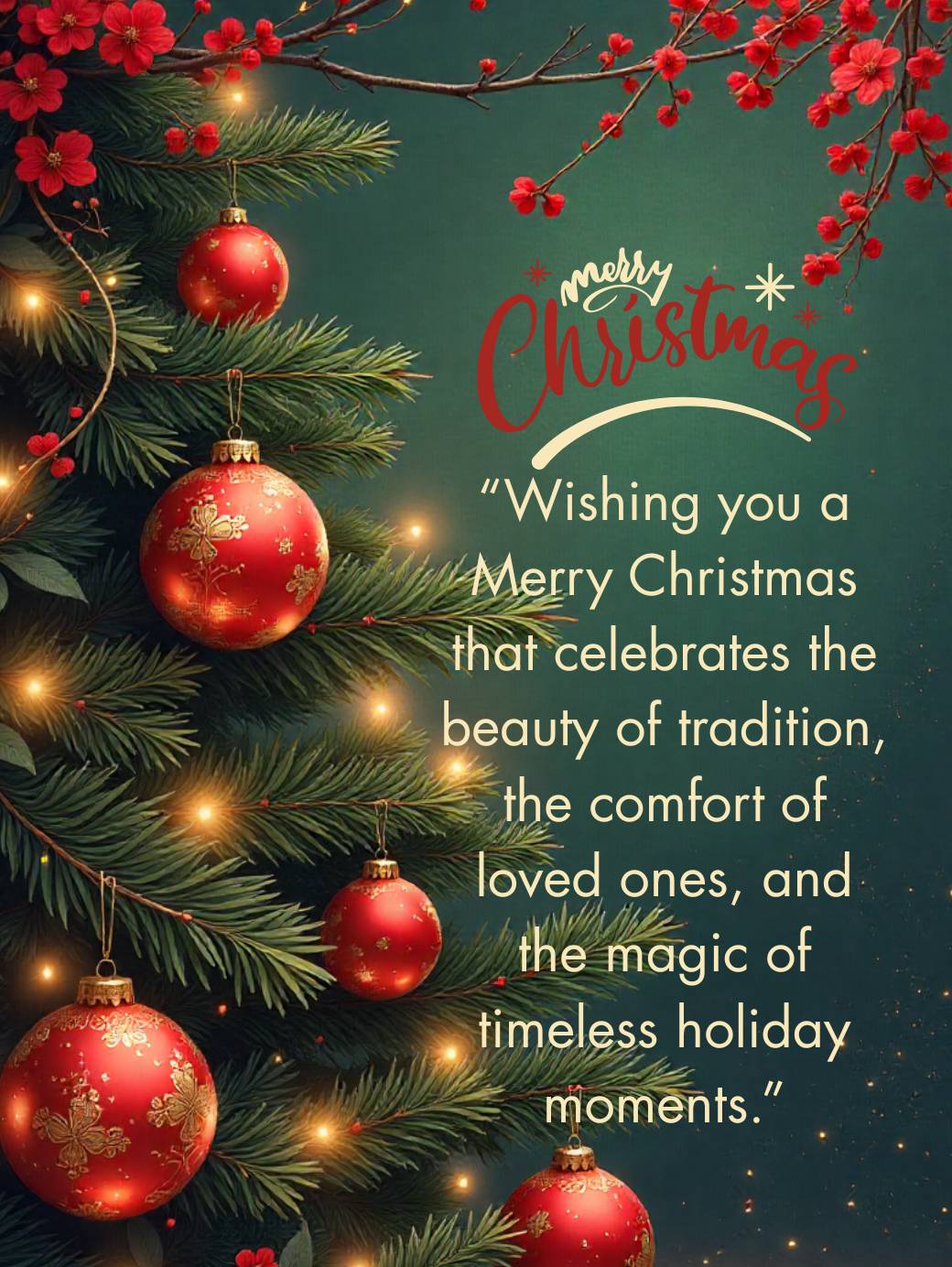 “Wishing you a Merry Christmas that celebrates the beauty of tradition, the comfort of loved ones, and the magic of timeless holiday moments.”