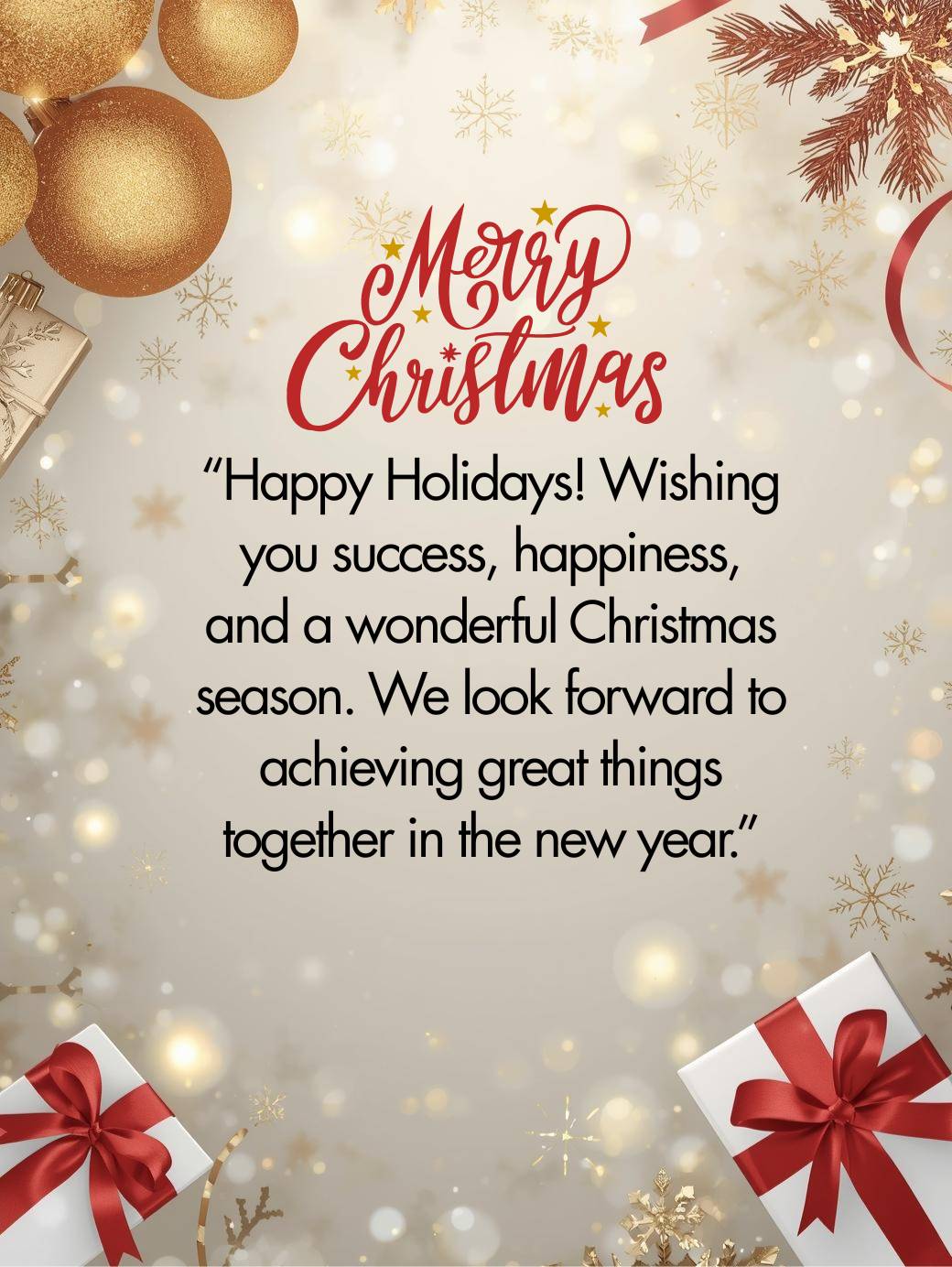 “Happy Holidays! Wishing you success, happiness, and a wonderful Christmas season. We look forward to achieving great things together in the new year.”