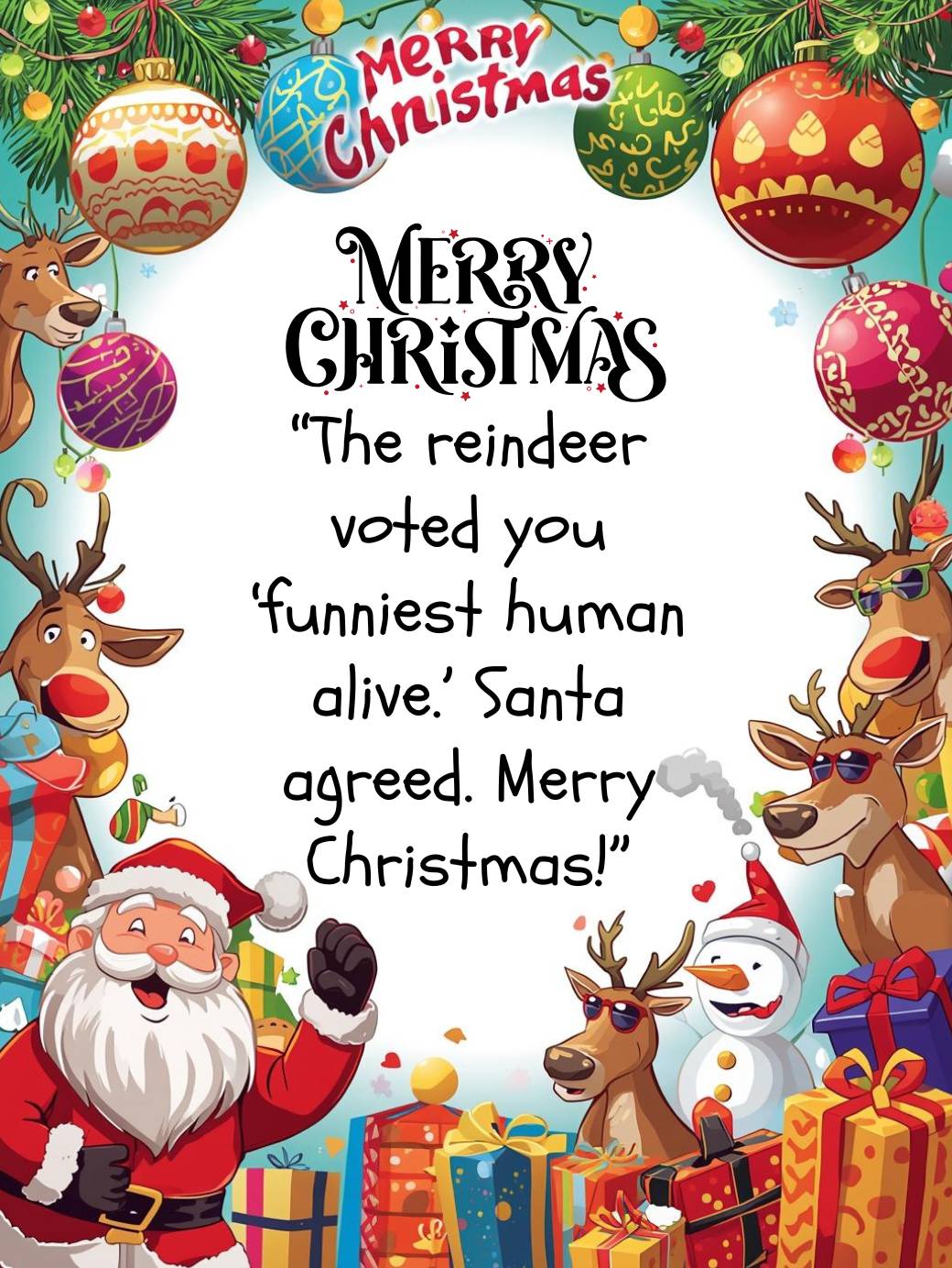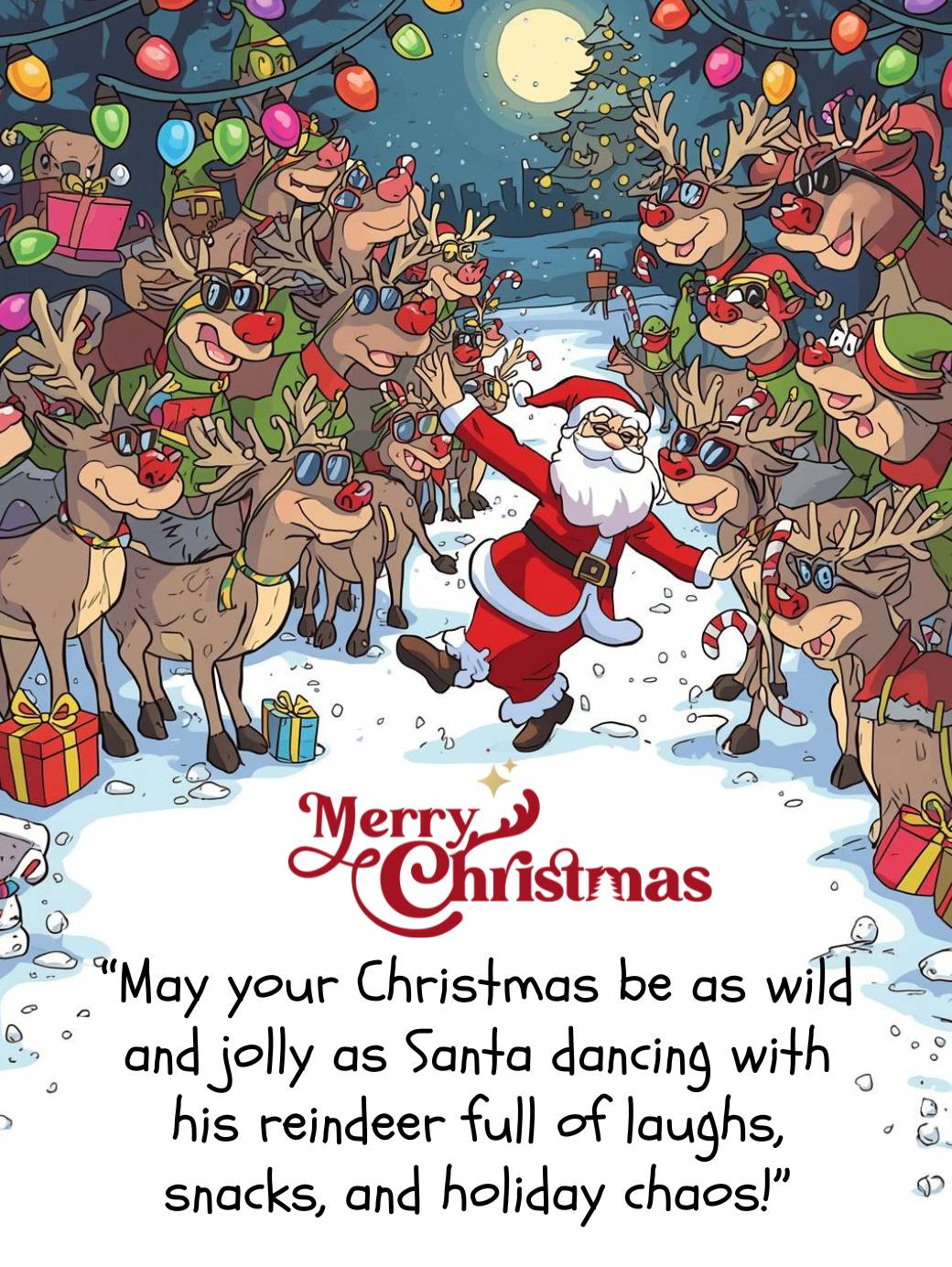“May your Christmas be as wild and jolly as Santa dancing with his reindeer full of laughs, snacks, and holiday chaos!”