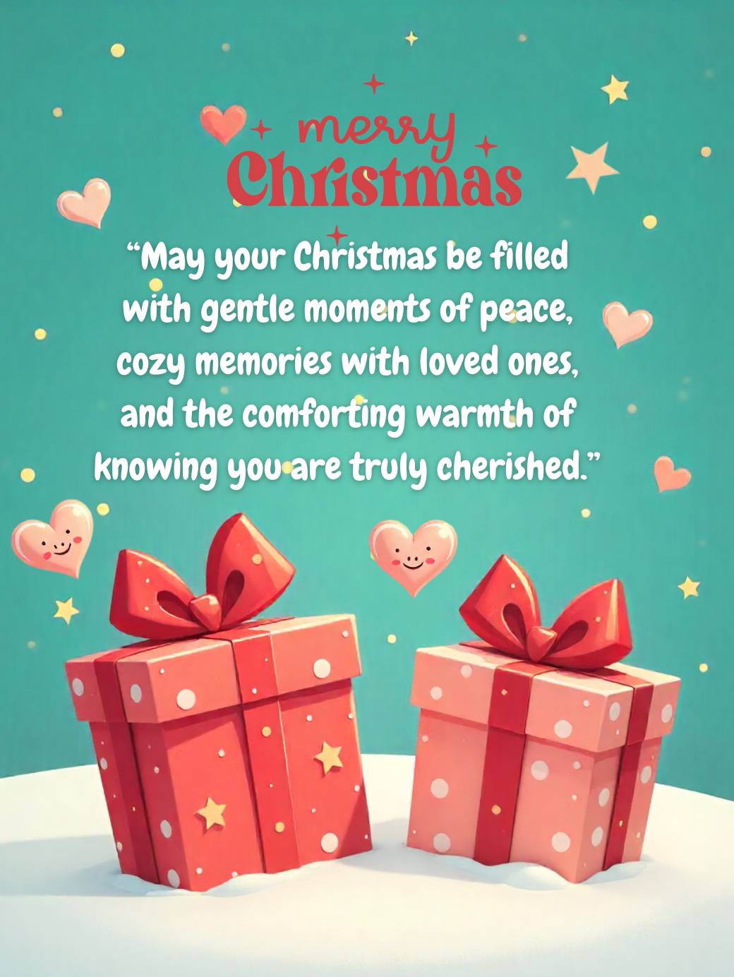 “May your Christmas be filled with gentle moments of peace, cozy memories with loved ones, and the comforting warmth of knowing you are truly cherished.”
