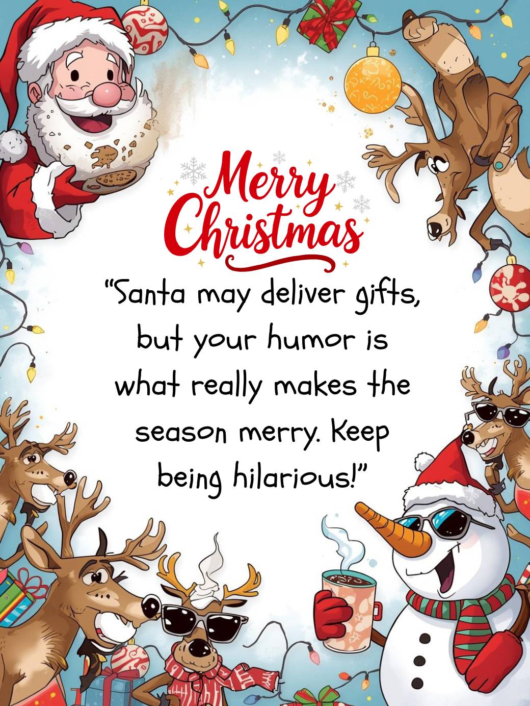 Merry Christmas funny wishes are lighthearted and humorous messages designed to bring laughter and joy during the festive season. Perfect for friends, family, or colleagues with a good sense of humor, these greetings often include playful jokes, witty lines, or amusing observations about Christmas traditions. Sharing funny Christmas wishes adds a cheerful twist to the holidays, making your cards, texts, or social media posts memorable and full of festive fun.