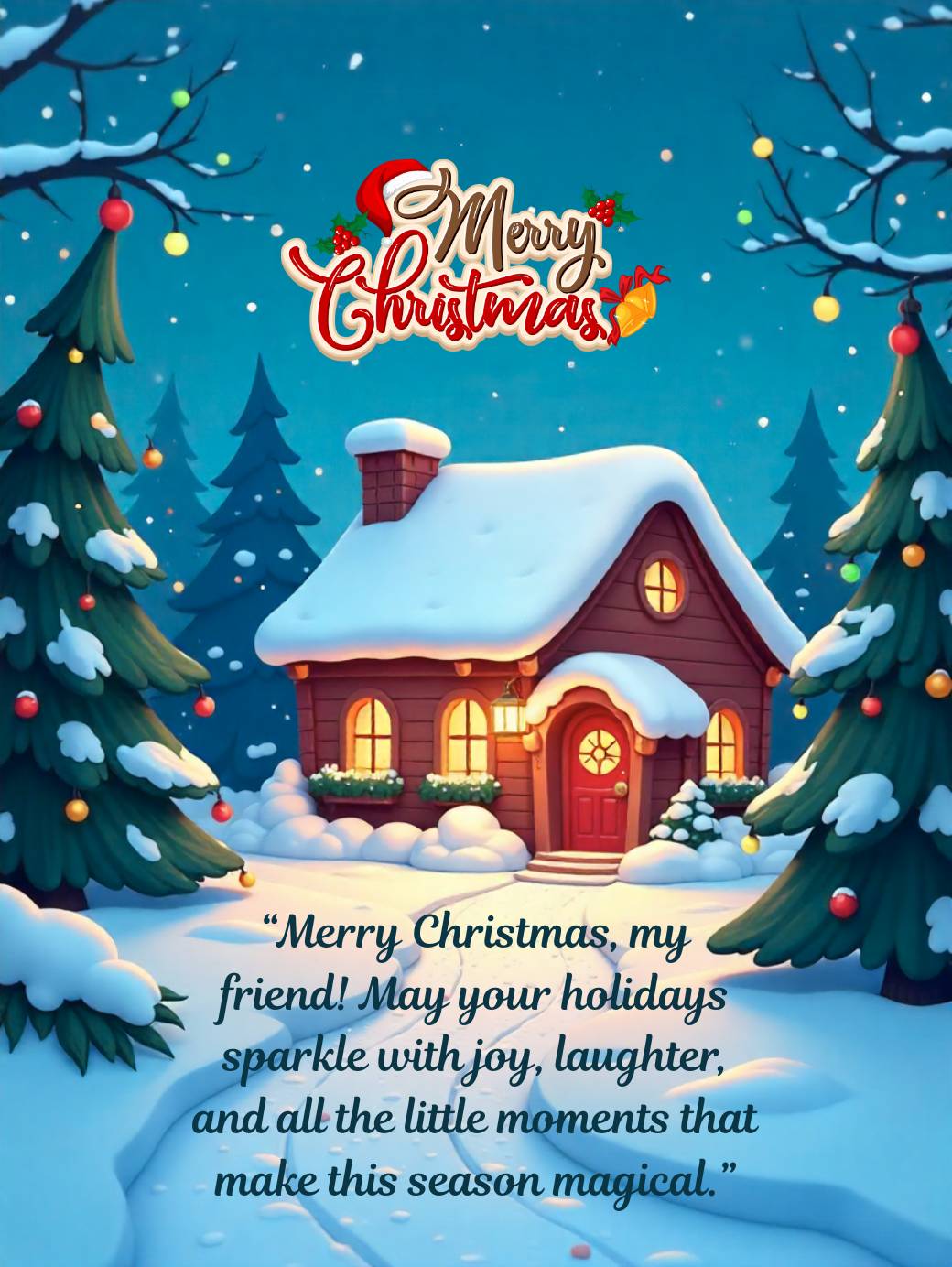 “Merry Christmas, my friend! May your holidays sparkle with joy, laughter, and all the little moments that make this season magical.”