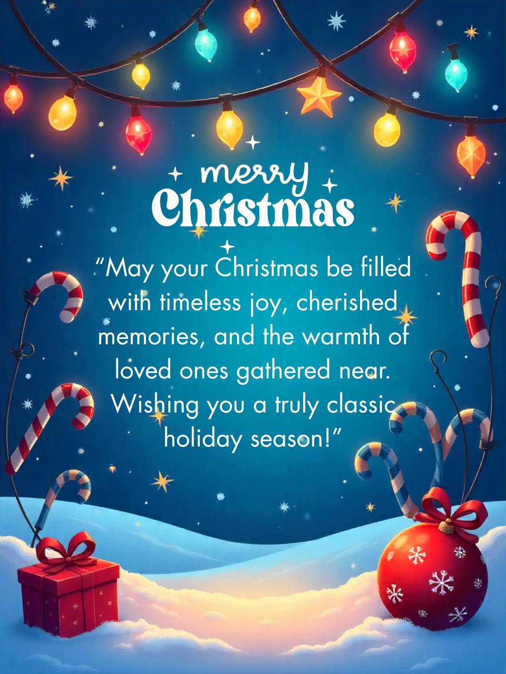 “May your Christmas be filled with timeless joy, cherished memories, and the warmth of loved ones gathered near. Wishing you a truly classic holiday season!”
