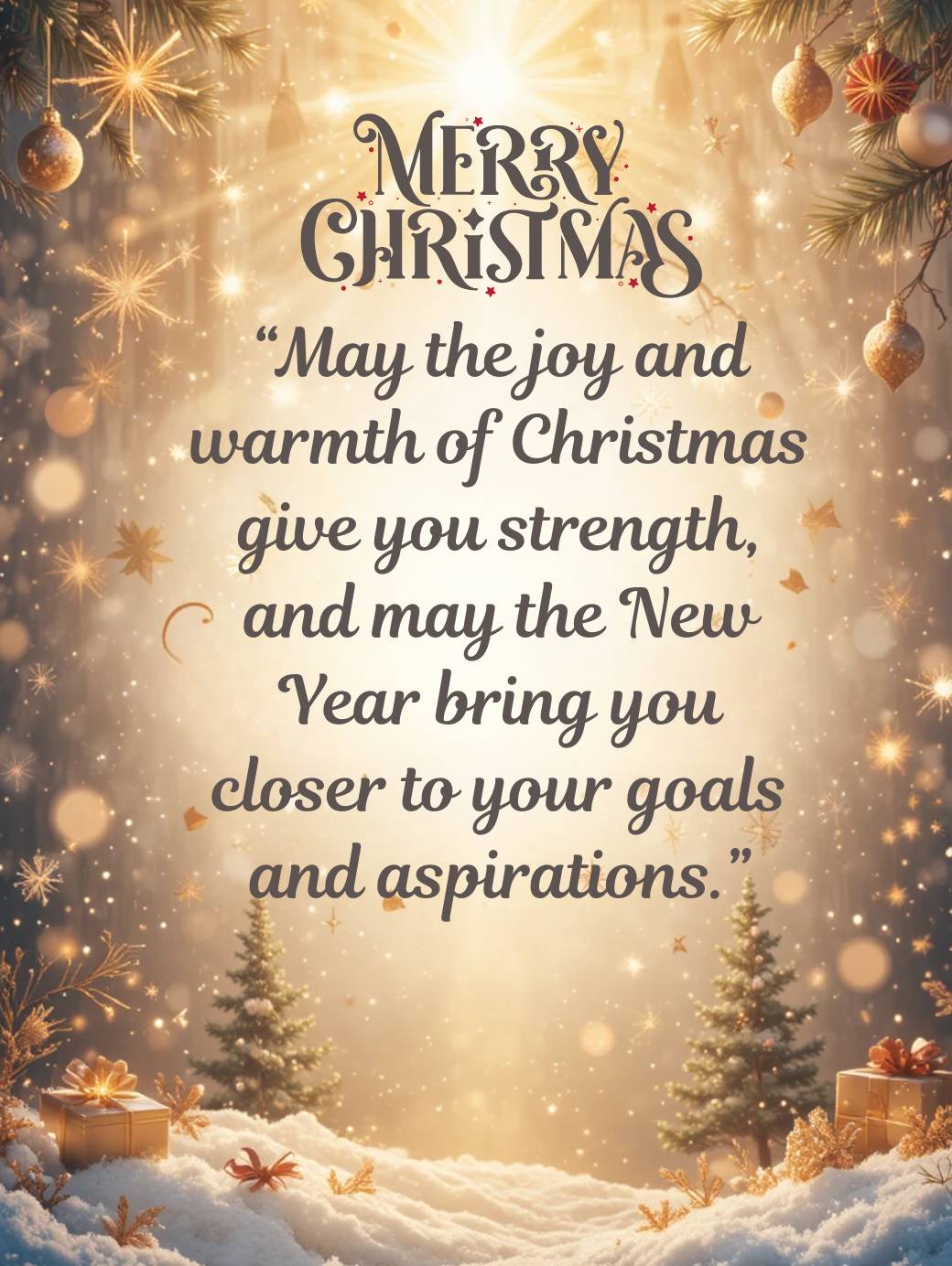 “May the joy and warmth of Christmas give you strength, and may the New Year bring you closer to your goals and aspirations.”