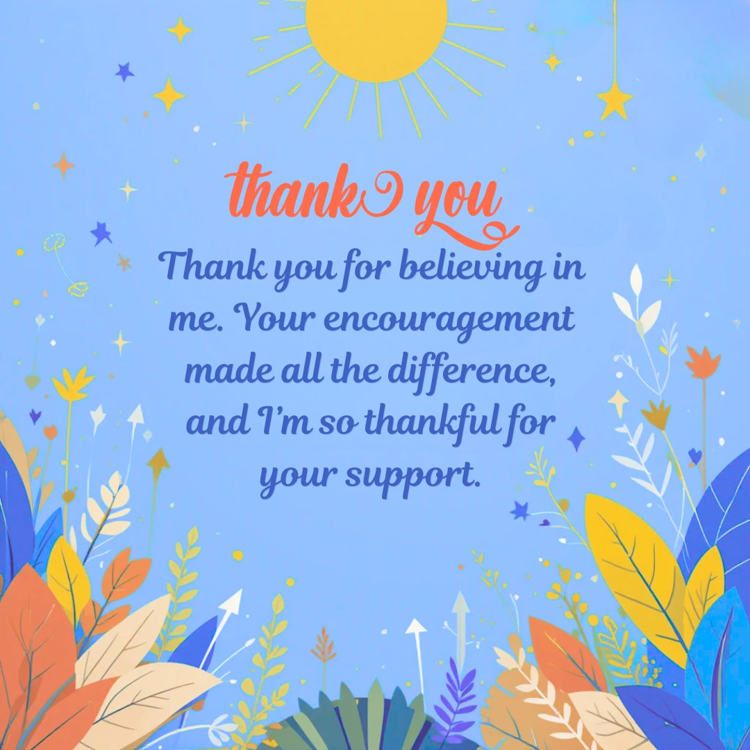 This Appreciative & Encouraging Thanks You message is designed to uplift and inspire, set against a calming blue background that symbolizes trust and sincerity. The layout is brightened with beautiful multicolor leaf decorations and a radiant sun at the top, symbolizing hope and positivity. Scattered colorful stars add a playful yet motivational touch to the overall design. The message — “Thank you for believing in me. Your encouragement made all the difference, and I’m so thankful for your support.” — expresses deep gratitude while also acknowledging the motivating impact of the recipient’s belief and support. It’s a perfect blend of appreciation and encouragement, ideal for mentors, friends, teammates, or anyone who helped you grow or move forward.