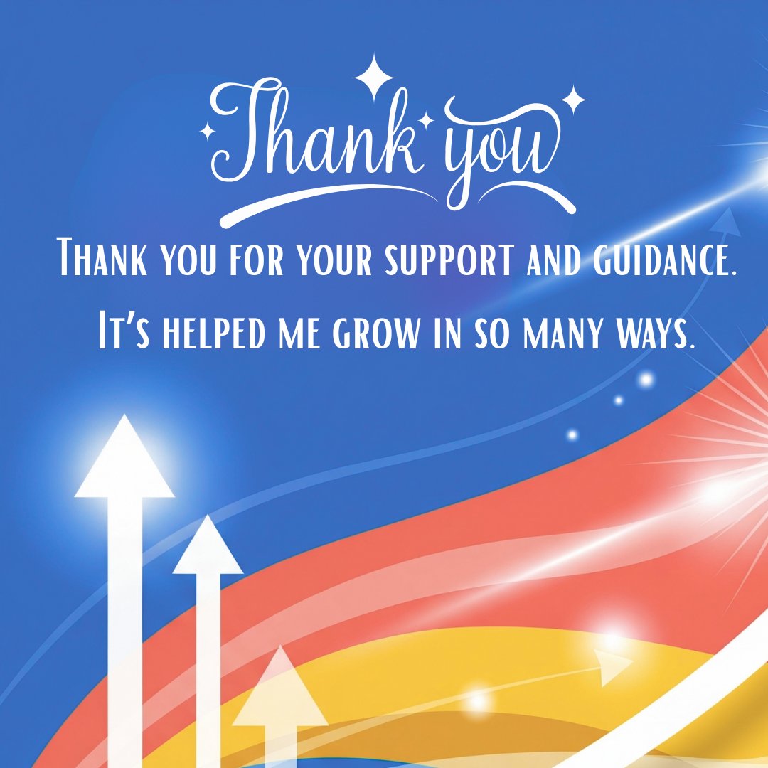 This Grateful and Motivated Thanks Message is designed to inspire and uplift, set against a vibrant background of bright blue, orange, and yellow that flows like energetic waves. The dynamic color scheme symbolizes progress, positivity, and momentum. Growth indicator symbols, such as upward arrows and abstract shapes, enhance the sense of movement and development. A large, decorative “Thank You” anchors the design, leading into the motivating message: “Thank you for your support and guidance. It’s helped me grow in so many ways.” This message blends heartfelt gratitude with a forward-looking tone, making it perfect for mentors, colleagues, or anyone whose encouragement has made a lasting impact. The overall look and feel reflect appreciation, progress, and personal growth.