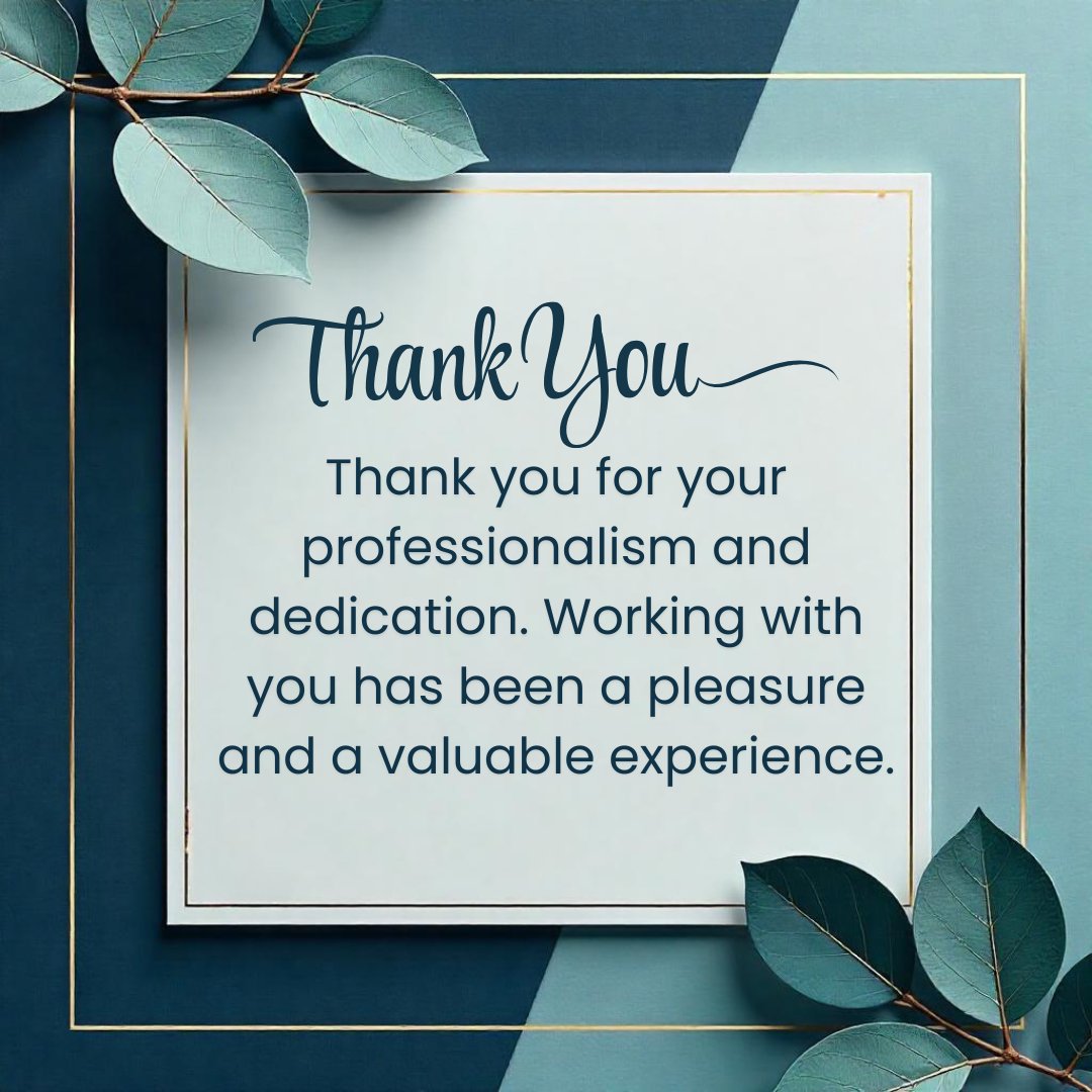 This Professional Gratitude Thanks Message is styled with a sophisticated and elegant design, featuring a luxurious combination of dark and light blue tones framed with refined golden linings. The top and bottom corners are adorned with beautifully shaded blue decorative leaves, adding a polished and graceful aesthetic. A fancy “Thank You” sits prominently at the center, followed by the message: “Thank you for your professionalism and dedication. Working with you has been a pleasure and a valuable experience.” The tone is respectful and appreciative, making it ideal for formal business relationships, colleague recognition, or client appreciation. The overall design and wording reflect professionalism, gratitude, and class.