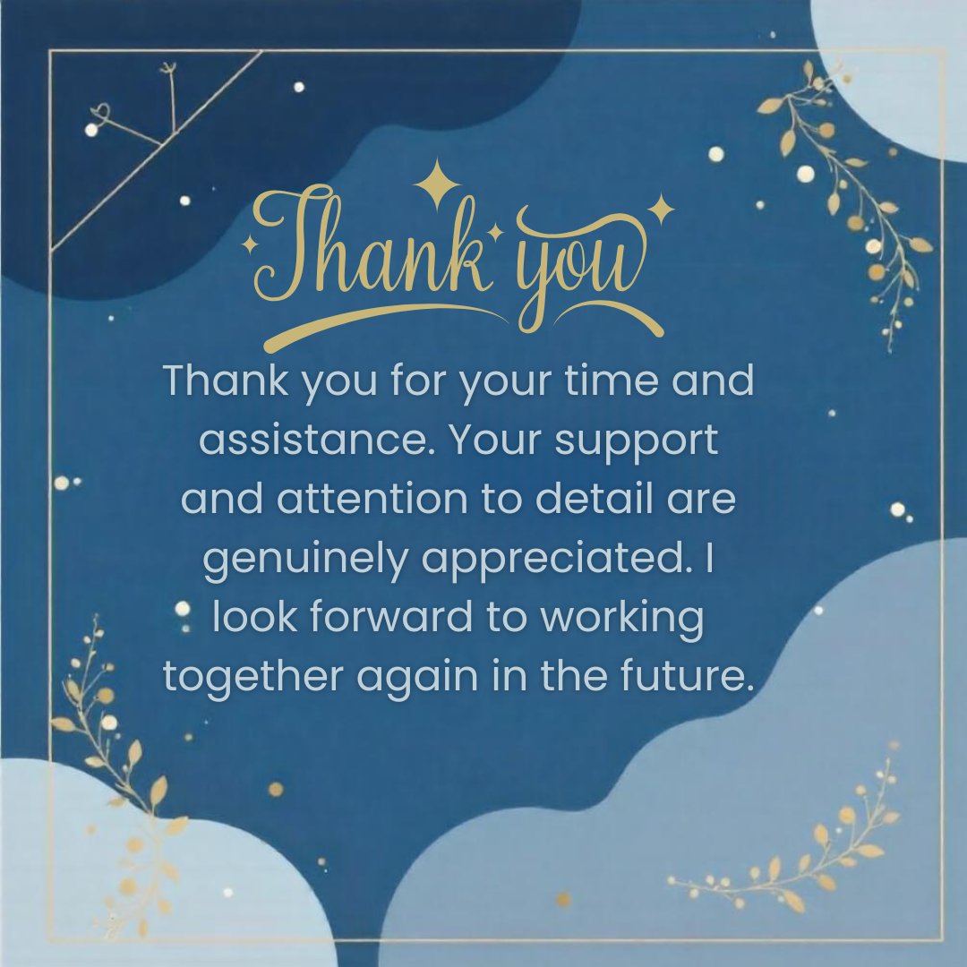 This Professional & Polite Thank You message is designed with a refined and elegant aesthetic, set against a calm blue background complemented by subtle blue shading. The addition of golden leaves and delicate branch decorations brings a touch of sophistication and grace to the overall layout. The message — “Thank you for your time and assistance. Your support and attention to detail are genuinely appreciated. I look forward to working together again in the future.” — conveys gratitude with professionalism and courtesy, making it ideal for workplace settings, client interactions, or formal business acknowledgments. The clean design and respectful tone strike the perfect balance between appreciation and professionalism.