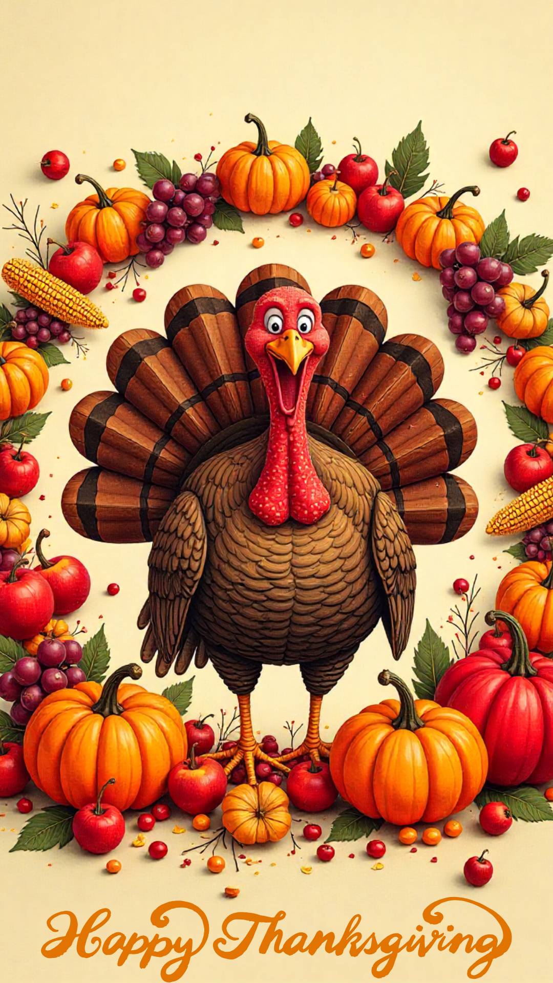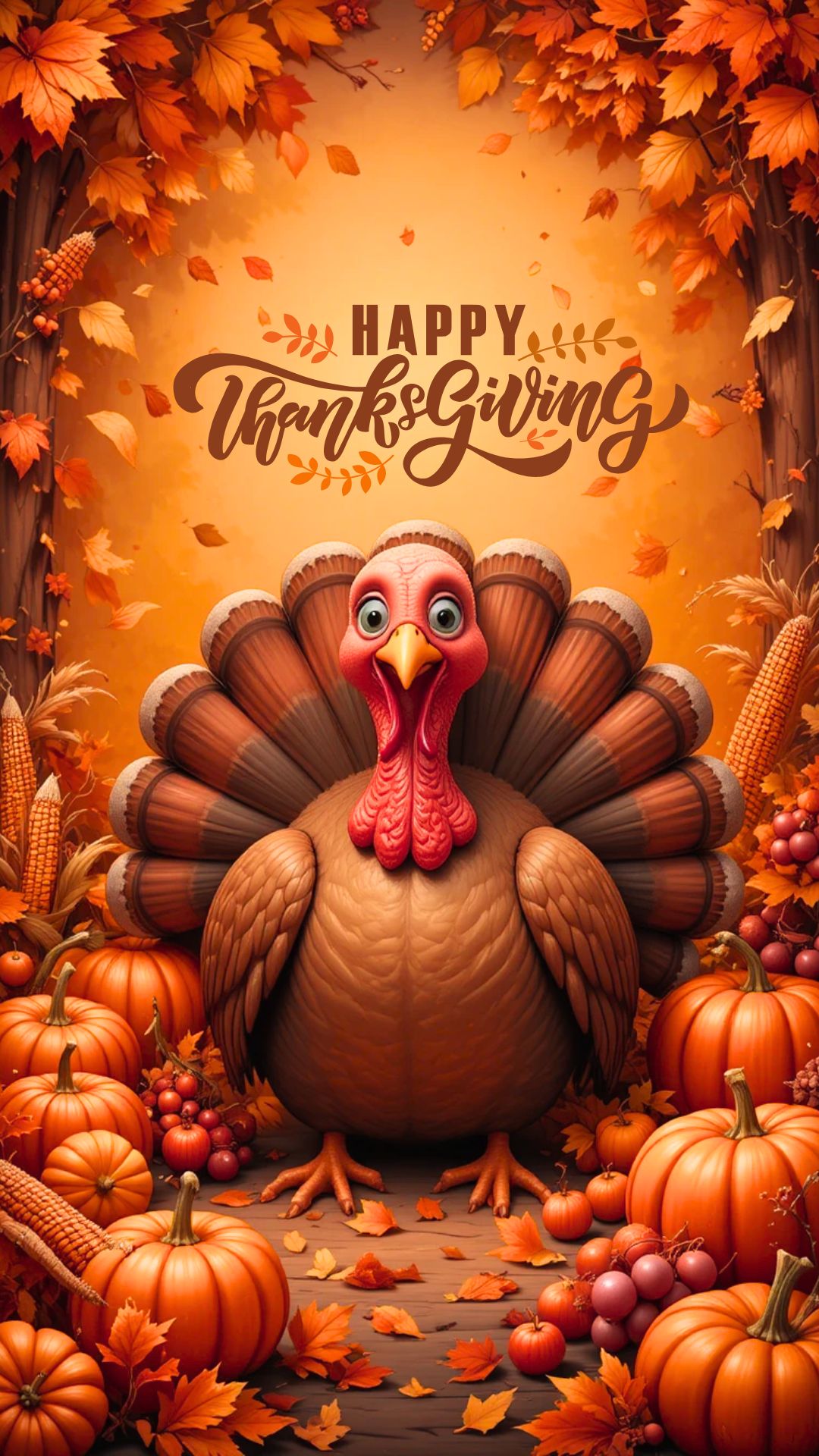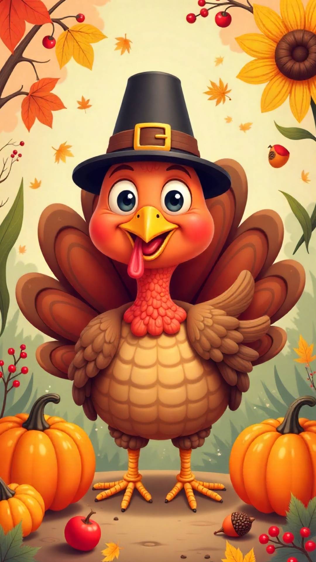 The image is a fun and colorful Thanksgiving iPhone wallpaper made in a bright vector style. It shows a cute, funny-faced turkey wearing a small pilgrim hat , surrounded by festive decorations like pumpkins, autumn leaves, acorns, corn stalks, berries, and sunflowers. Garlands, fairy lights, and sparkles add a joyful holiday feel. Warm colors such as orange, gold, red, and brown, along with soft gradients and shadows, make the design look lively and detailed. A gentle glowing background helps everything stand out. . The overall design feels cheerful, playful, and perfect for a festive Thanksgiving wallpaper.