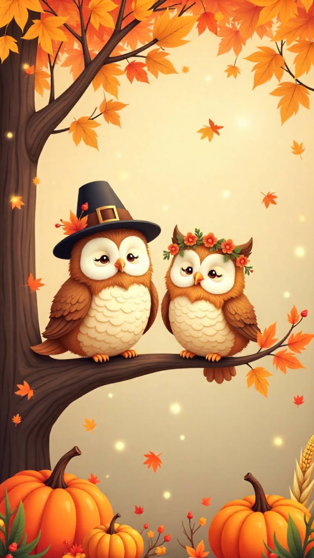 This charming Happy Thanksgiving Wallpaper features two adorable owls perched on a tree branch, dressed in festive Thanksgiving costumes ,one with a pilgrim hat and the other with an autumn wreath. Surrounding them are warm vector decorations like pumpkins, colorful fall leaves, acorns, berries, corn stalks, and soft glowing fairy lights. A warm gradient background in gold, orange, and soft brown, paired with gentle sparkles and floral accents, creates a cozy and cheerful atmosphere.