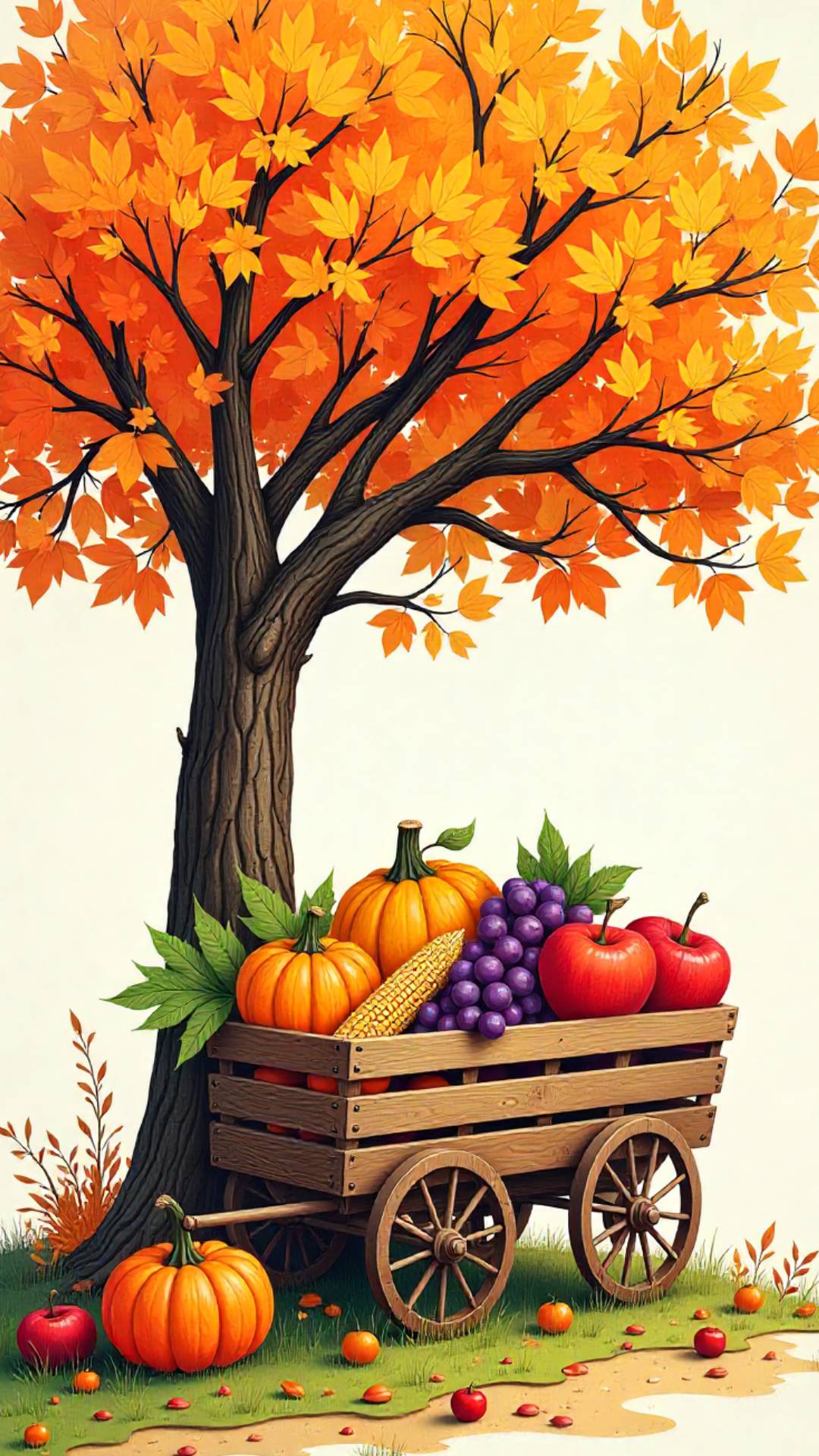 The image is a festive Thanksgiving Background for iPhone in a clean vector style. It shows a charming fruit cart filled with pumpkins, apples, grapes, and corn, set under a large autumn tree. Around it are fall decorations like colorful leaves, acorns, wheat, and berries. Warm colors of orange, gold, red, and brown, along with soft shadows and gentle lighting, make the scene feel cozy and inviting. The layout is balanced and vertical, leaving space for app icons, perfect for celebrating the harvest and Thanksgiving season.