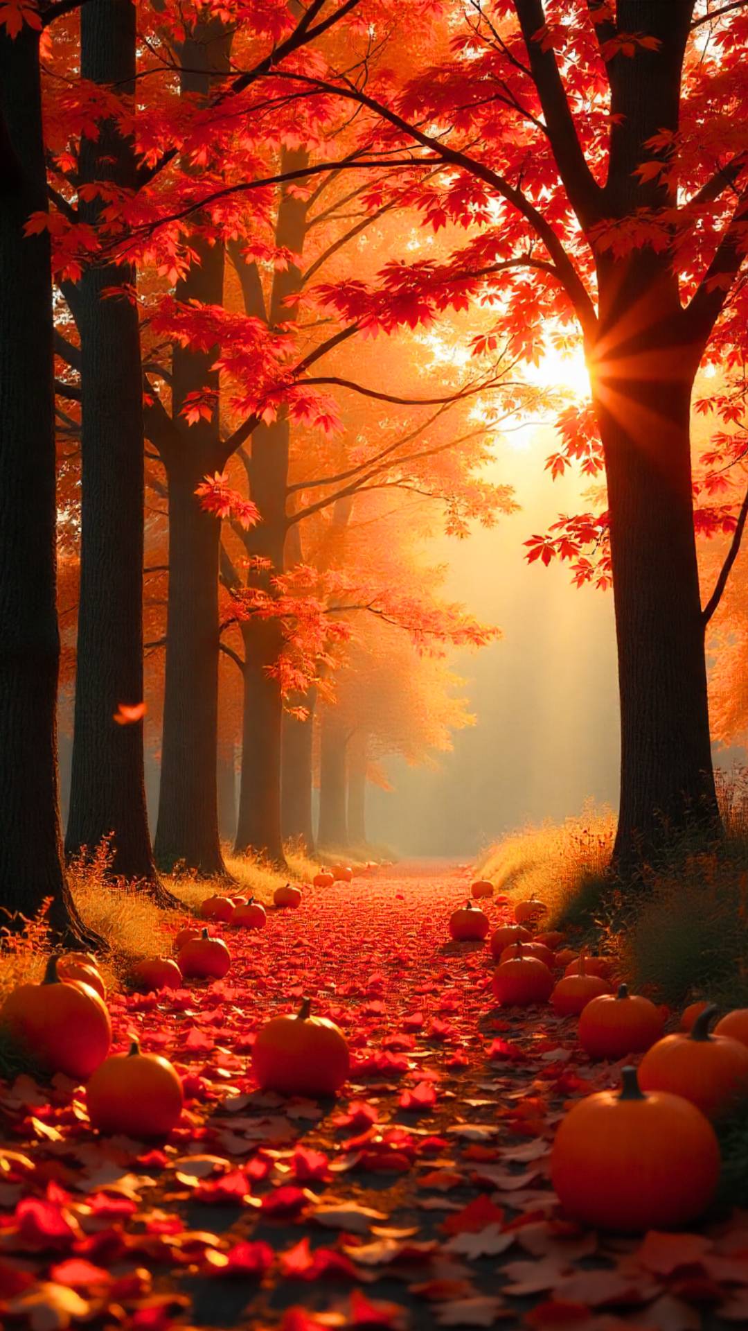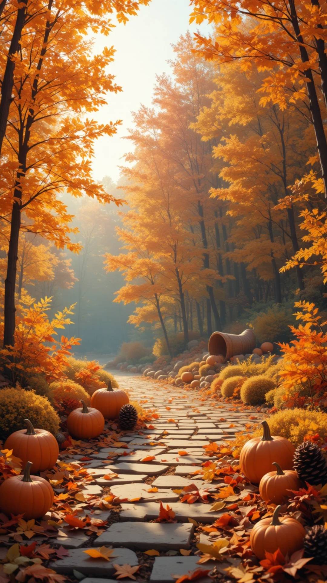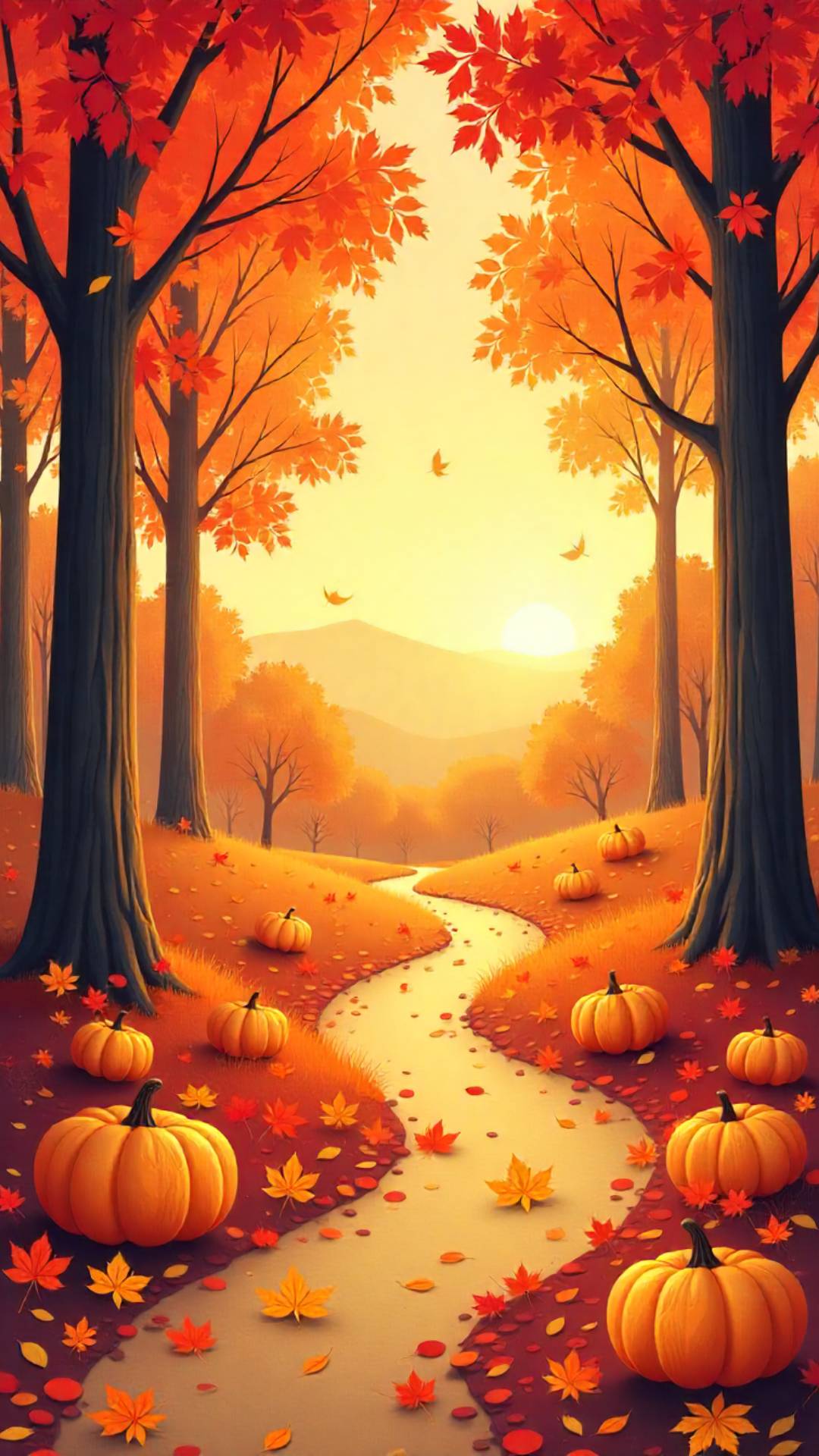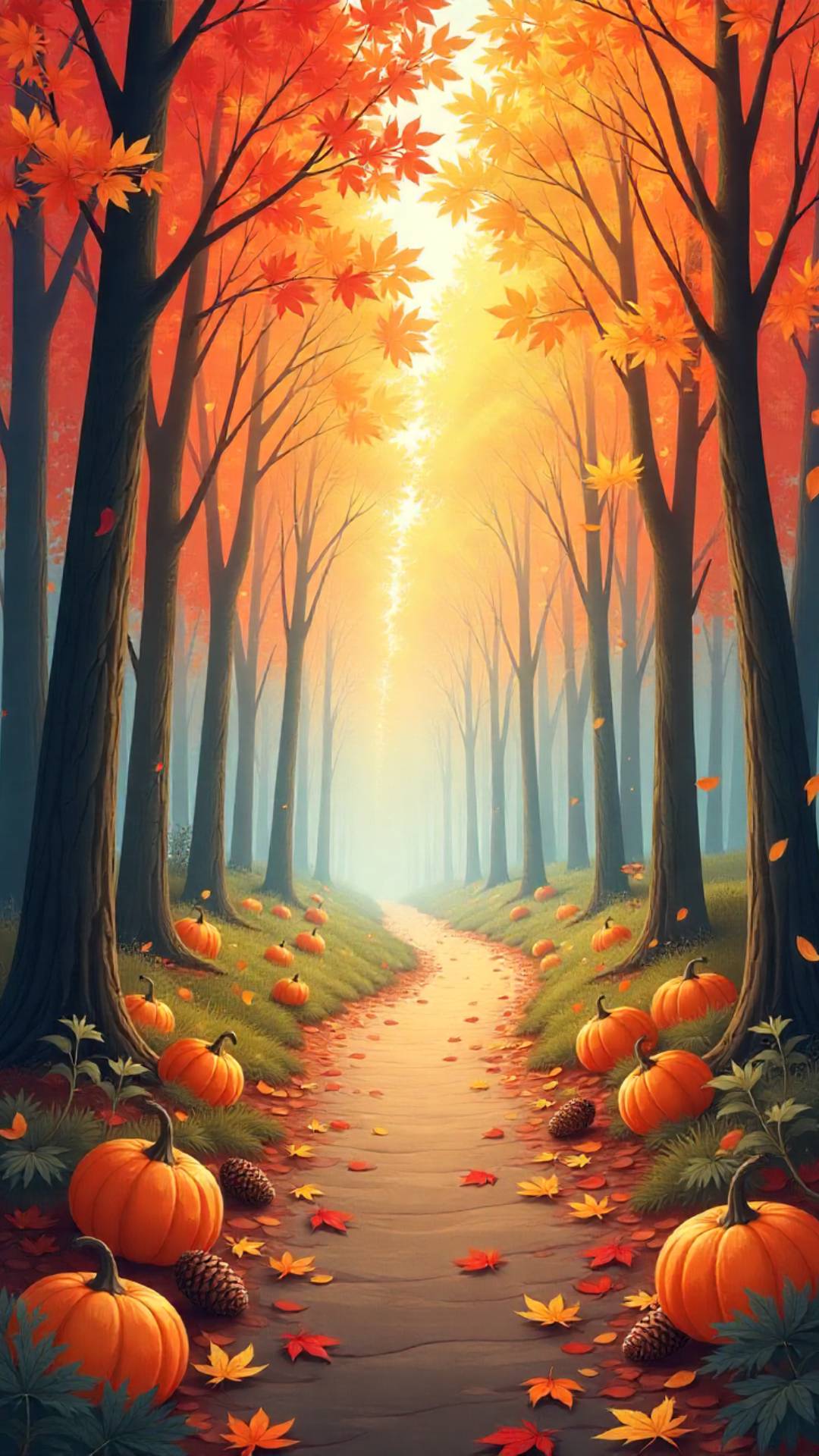 This serene Thanksgiving iPhone background showcases a peaceful autumn scene with colorful fall trees, gently drifting leaves, and a warm sunlit forest path. Soft pumpkins, scattered leaves, pinecones, and a subtle cornucopia in the background enhance the seasonal feel without emphasizing food. Warm shades of orange, gold, red, and brown, along with gentle lighting and textures makes it more beautiful.