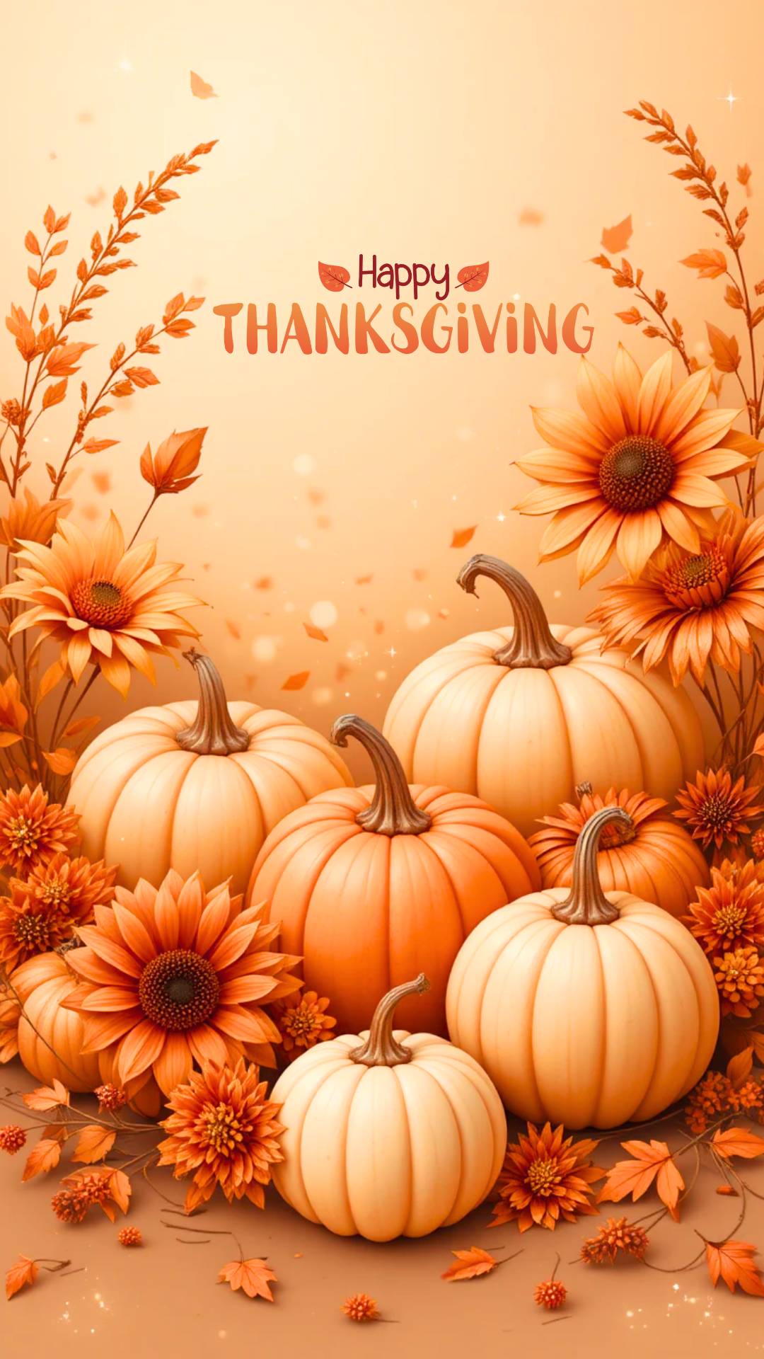 The image is a warm and festive Thanksgiving Phone wallpaper in a clean vector style. It shows soft pumpkins in orange, cream, and gold, surrounded by autumn flowers like sunflowers, chrysanthemums, and dahlias, along with wheat, berries, and colorful leaves. The elements are arranged smoothly across the screen, leaving space for app icons. Warm colors, gentle lighting, and soft shadows create a cozy, glowing feel, with tiny sparkles or bokeh adding extra charm. Overall, the wallpaper feels peaceful, festive, and perfect for celebrating Thanksgiving.