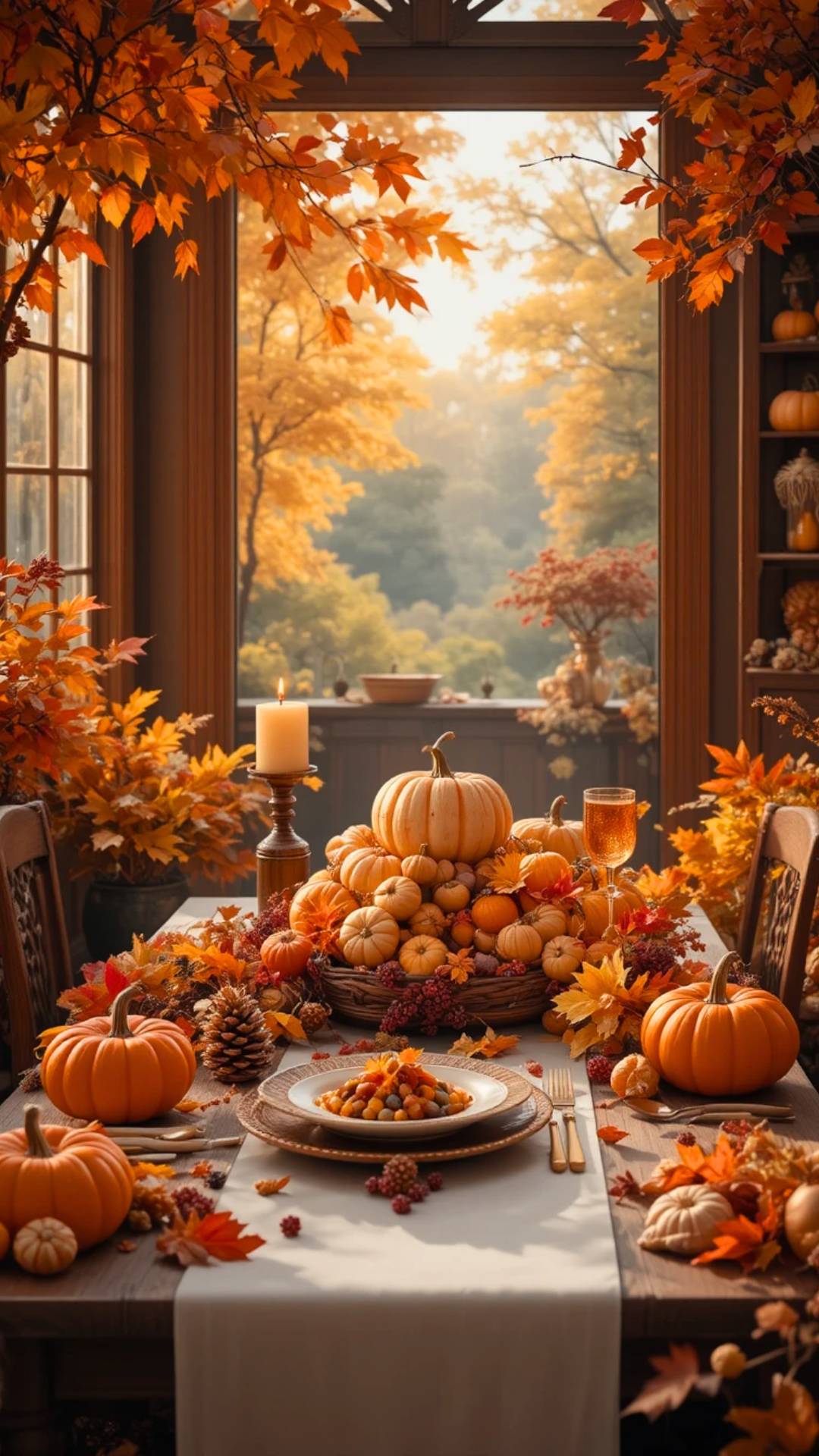 This Most popular wallpaper for iPhone features a high-quality vector design with a central scene of a decorated rustic table or cozy autumn landscape. Pumpkins, colorful fall leaves, cornucopia, pinecones, and candles create a warm, festive atmosphere, enhanced by soft sunlight, gentle shadows, and subtle textures. Rich shades of orange, gold, red, and brown add seasonal charm, while the clean vector style keeps the design crisp and elegant.