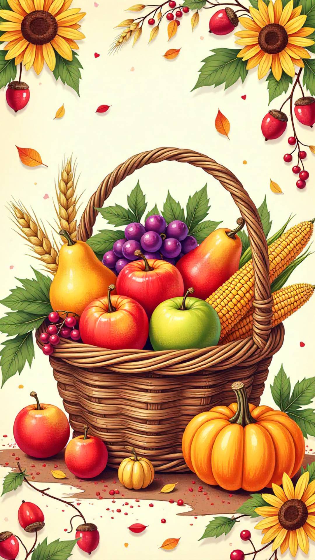 The image is a bright and festive Thanksgiving iPhone wallpaper showing a beautifully arranged fruit basket with apples, grapes, pears, corn, and pumpkins. Around the basket are autumn decorations like leaves, acorns, wheat stalks, berries, sunflowers, and glowing candles. Fairy lights and sparkles add extra warmth. The colors are rich autumn shades of orange, gold, red, and brown, with soft highlights and gradients. Overall, it feels cozy, heartwarming, and perfect for celebrating the harvest season.