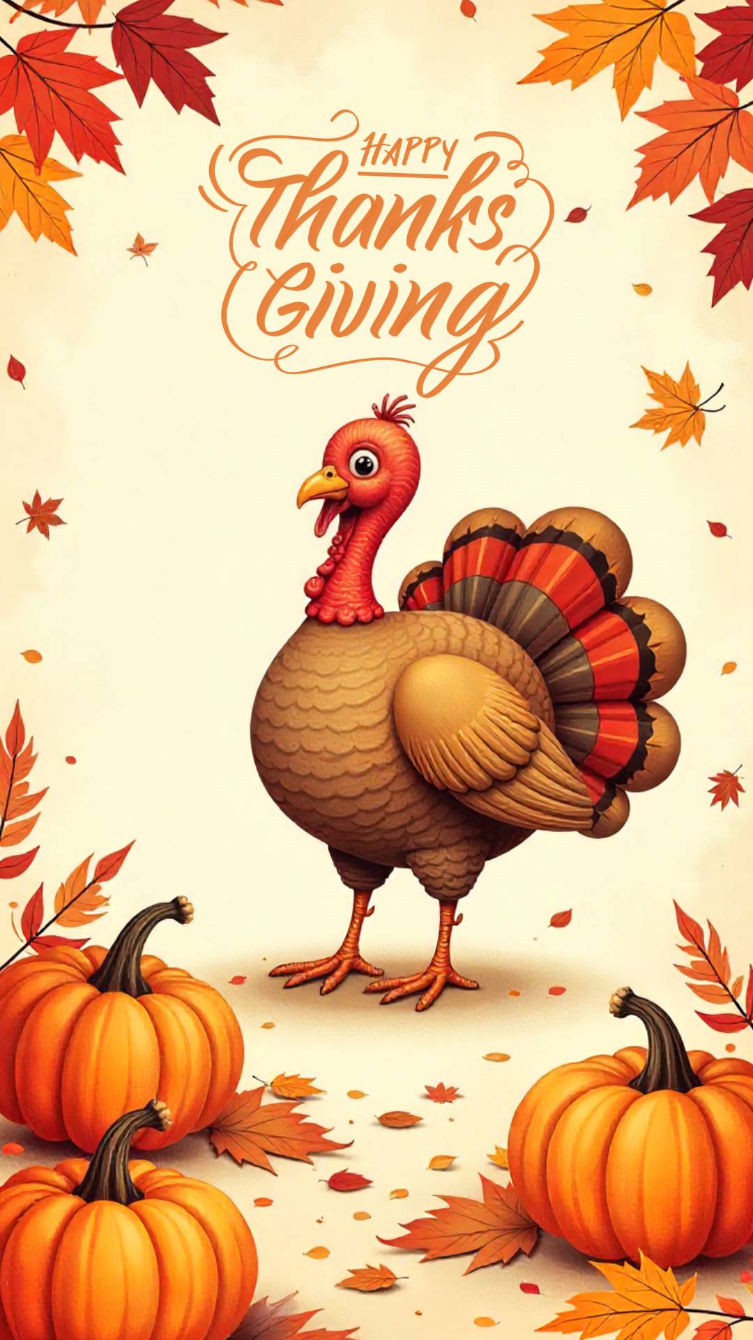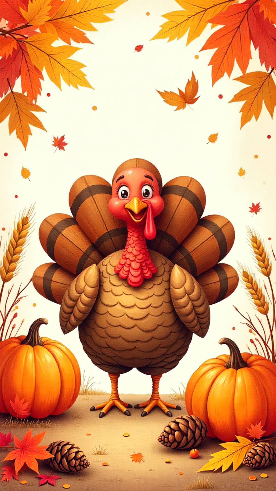 This iPhone Wallpaper for Thanksgiving features a cozy autumn scene with pumpkins, colorful fall leaves, a cornucopia, and a cheerful turkey illustration at the center. Warm tones of orange, gold, brown, and red create a festive, inviting atmosphere, enhanced by soft lighting, subtle textures, and gentle shadows. Playful touches like falling leaves or light sparkles add charm, while the left or top-left area remains clear for desktop icons. The overall design feels joyful, balanced, and perfect for a Thanksgiving-themed laptop background.