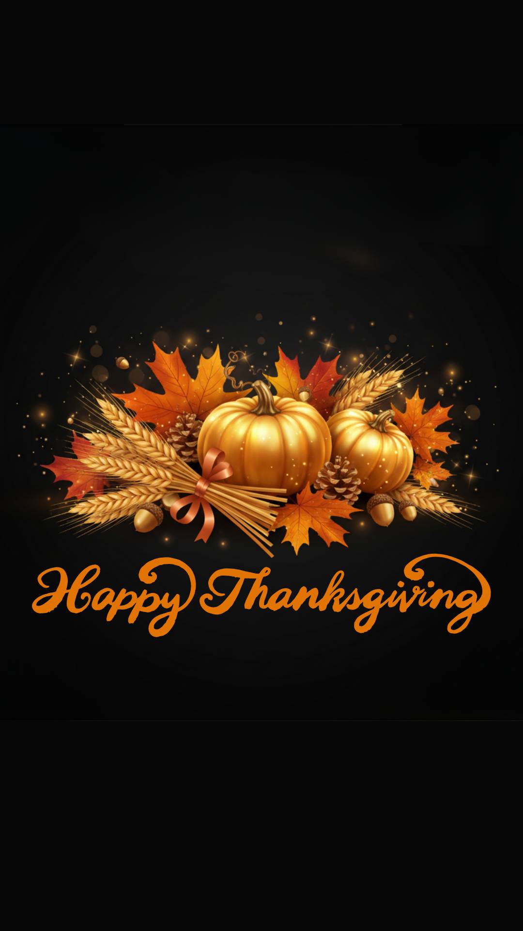 This stylish Thanks giving wallpapers HD iPhone showcases a rich black background highlighted by radiant autumn elements, including golden pumpkins, wheat stalks, maple leaves, pinecones, and acorns. Gentle sparkles, smooth gradients, and intricate golden patterns give the design depth and elegance. The phrase “Happy Thanksgiving Day” is displayed in metallic gold calligraphy, giving the overall look a warm, festive, and sophisticated feel, ideal for a contemporary holiday theme.