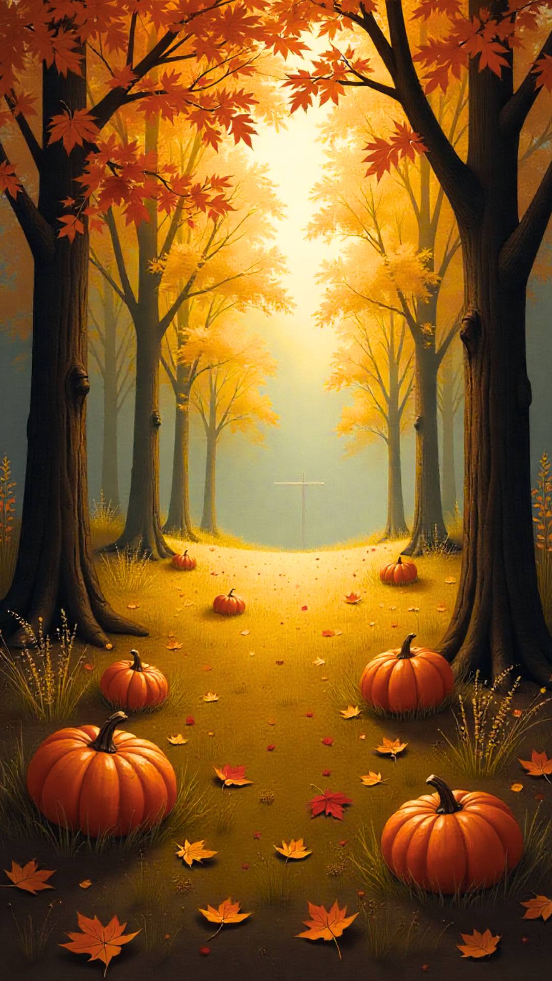 This spiritual iPhone Thanksgiving background shows a peaceful autumn scene with soft golden light shining through the trees. Fall leaves, pumpkins, wheat stalks, and gentle candles add a warm, cozy feeling. Hands in prayer, a glowing cross, or a soft halo blend naturally into the scene, creating a calm and reflective mood. Warm colors like gold, orange, red, and brown with soft shadows make the design feel inviting and heartwarming, perfectly capturing the spirit of gratitude and faith for Thanksgiving.