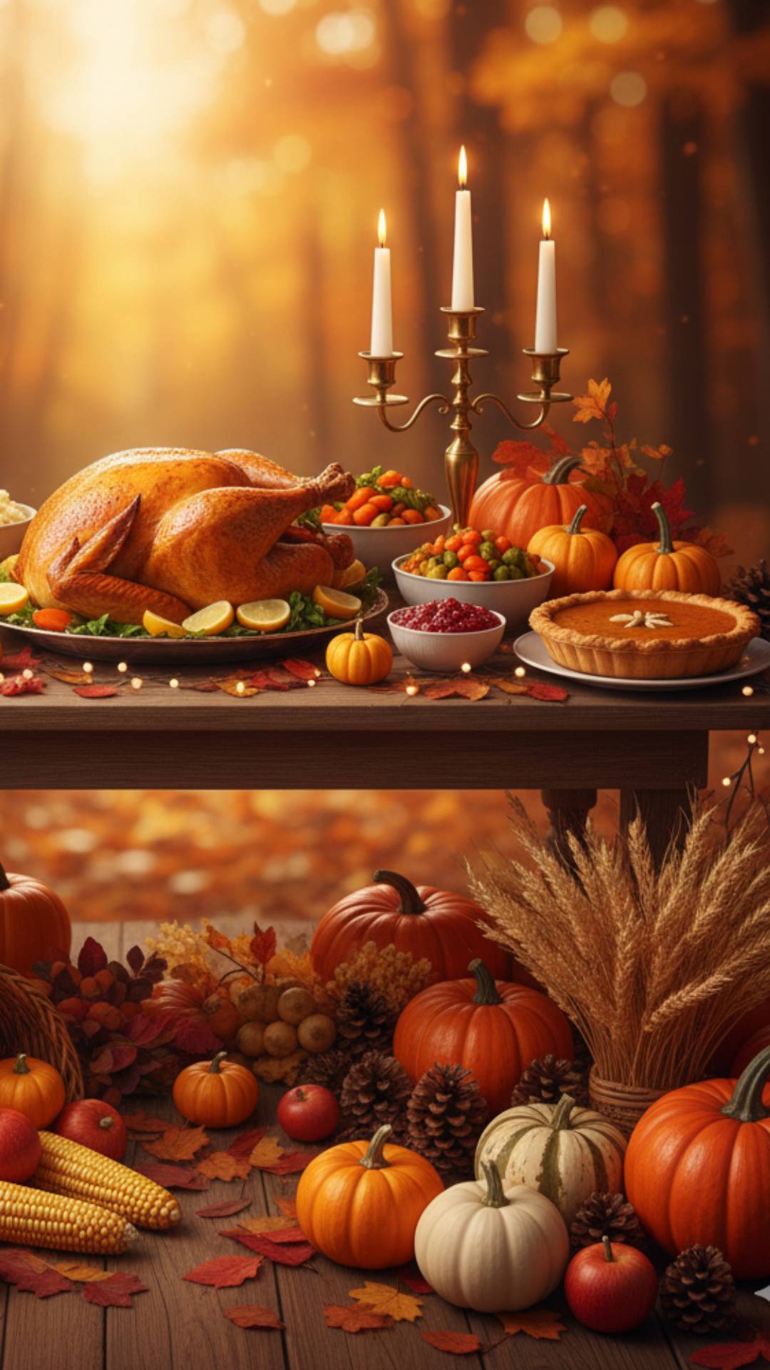The image shows a festive iPhone Thanksgiving background featuring a large rustic table full of a delicious holiday feast. It includes a golden roasted turkey, mashed potatoes, stuffing, cranberry sauce, pumpkin pie, bread, vegetables, and desserts. Autumn decorations like pumpkins, colorful leaves, cornucopia, candles, and pinecones surround the table. Warm colors like orange, gold, brown, and red, along with soft lighting and shadows, make the scene cozy and inviting. The perspective shows the full spread, and the layout leaves space for icons or text. Overall, it looks festive, vibrant, and captures the joy and abundance of Thanksgiving perfectly.