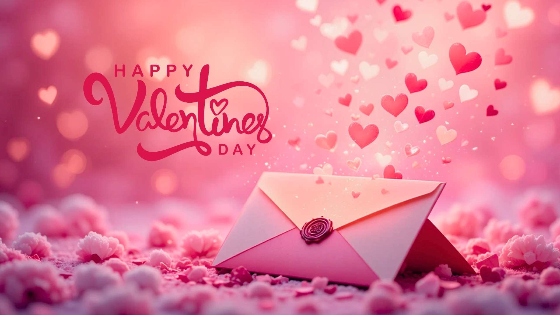 This Valentine’s Day wallpaper for desktop features a beautiful letter from which hearts are coming out, symbolizing love and heartfelt emotions. The words “Happy Valentine’s Day” are written in a beautiful font, adding a romantic and elegant touch to the overall design.