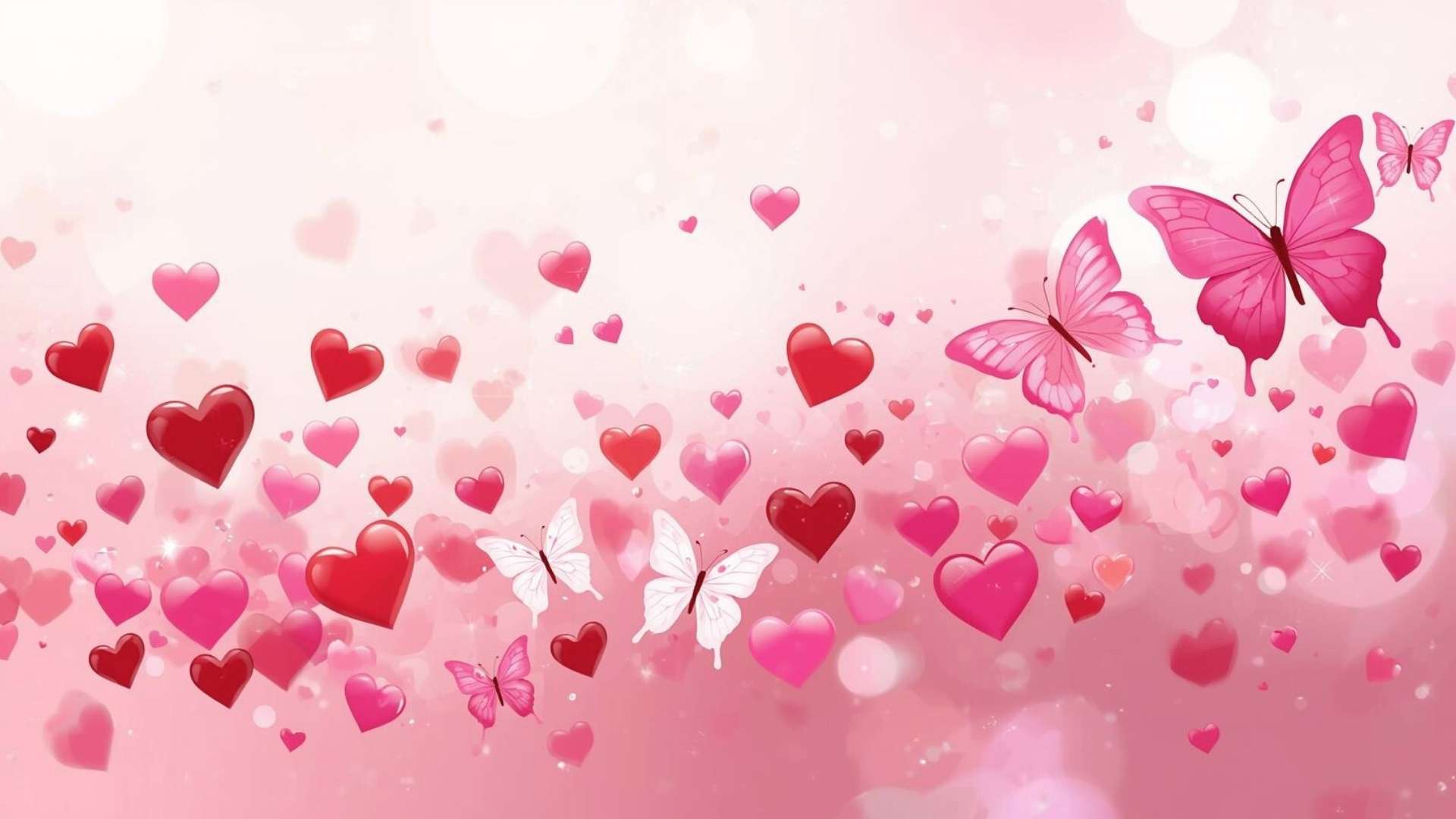 This creative Valentine’s Day wallpaper showcases a background filled with pink and red hearts and fluttering butterflies. The vibrant colors and playful elements create a lively, romantic atmosphere, perfect for celebrating the joy and love of Valentine’s Day.