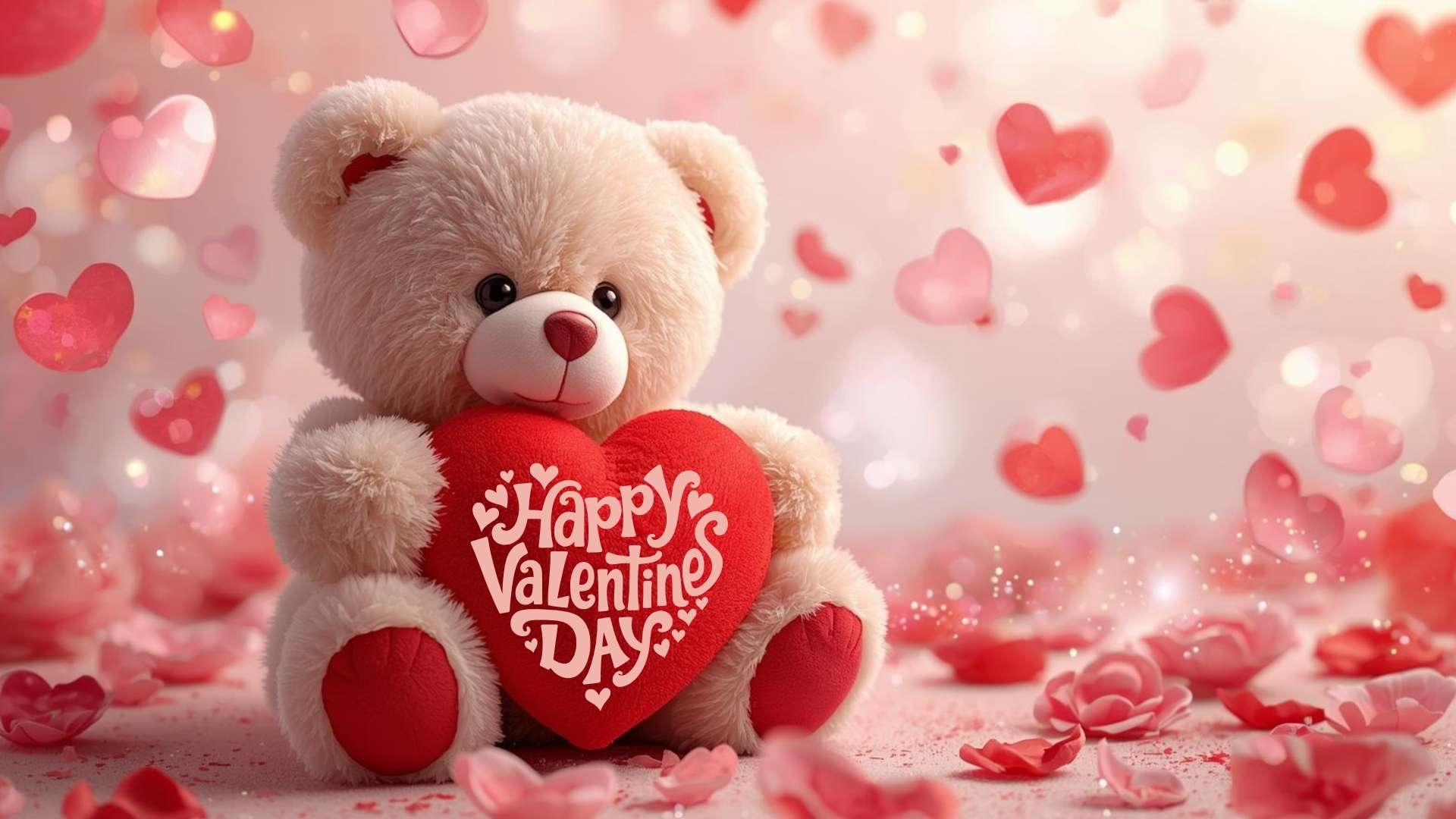 This cute Valentine’s Day wallpaper features an adorable teddy bear holding a heart with “Happy Valentine’s Day” written on it. The beautiful background filled with hearts and soft petals adds a sweet, romantic charm, making the wallpaper perfect for spreading love and warm Valentine vibes.