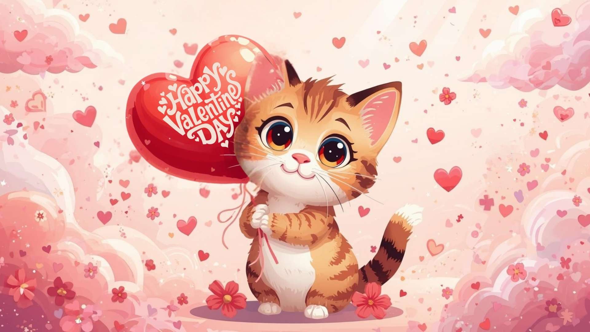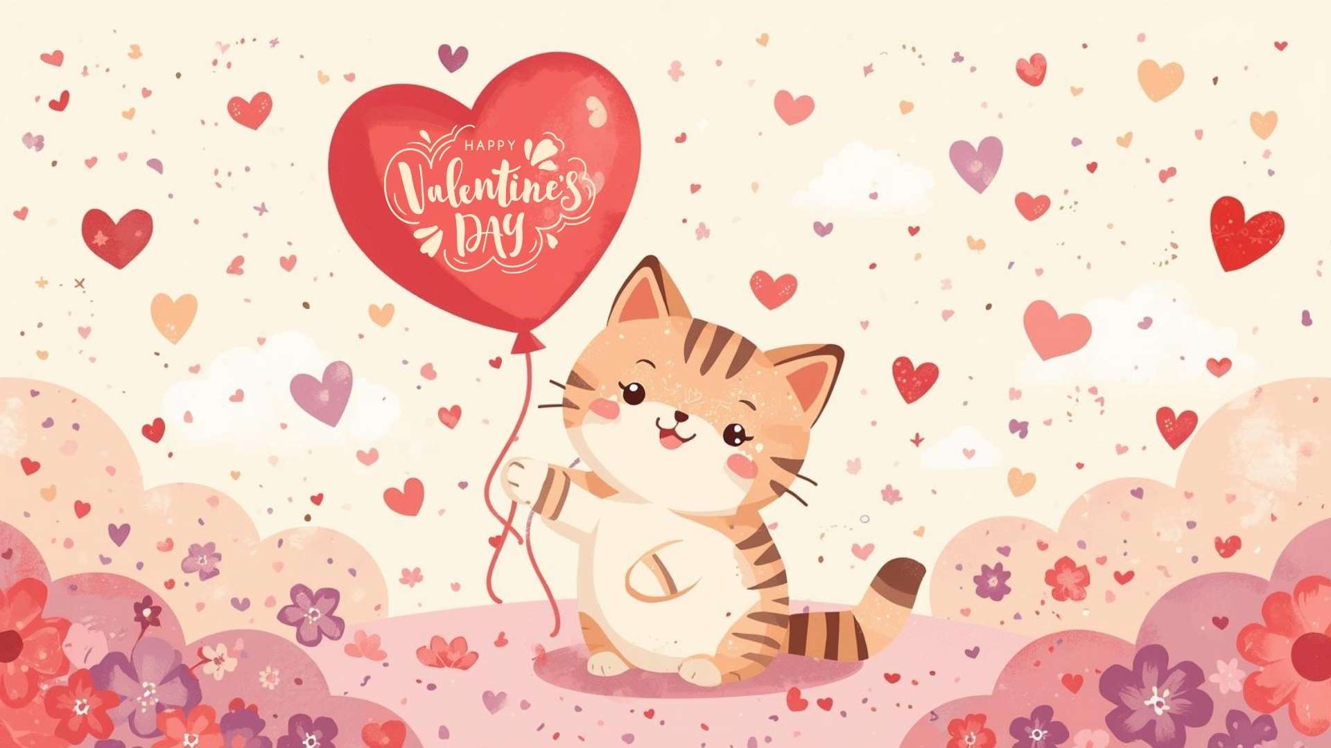 This Cute Valentine’s Day background features an adorable kitten holding a red balloon, with “Happy Valentine’s Day” written in a heart shape, set against a charming backdrop of hearts and flowers. The playful and sweet design creates a joyful and loving Valentine’s Day vibe.