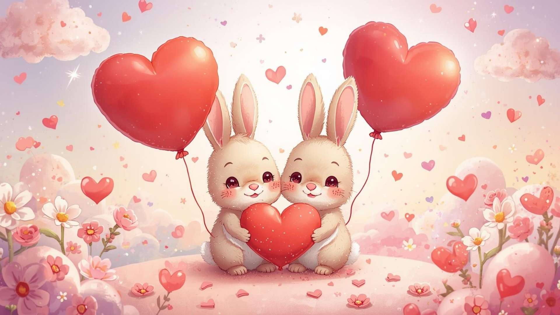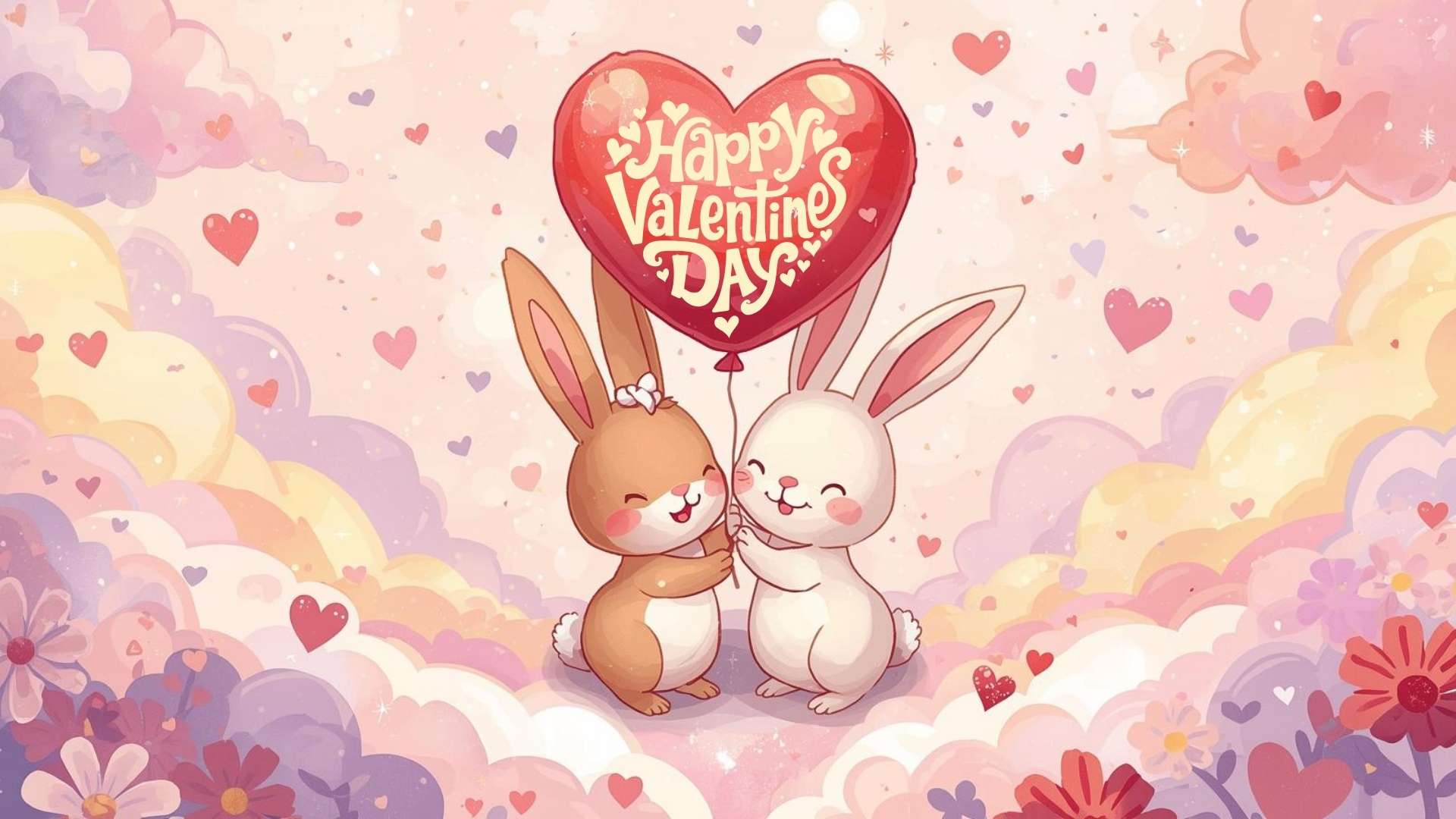 This Cute and Playful Valentine’s Day wallpaper features two adorable bunnies holding a red balloon, with “Happy Valentine’s Day” written in a heart shape. The background is filled with hearts, flowers, and charming clouds, creating a sweet, cheerful, and heartwarming design perfect for Valentine’s Day.