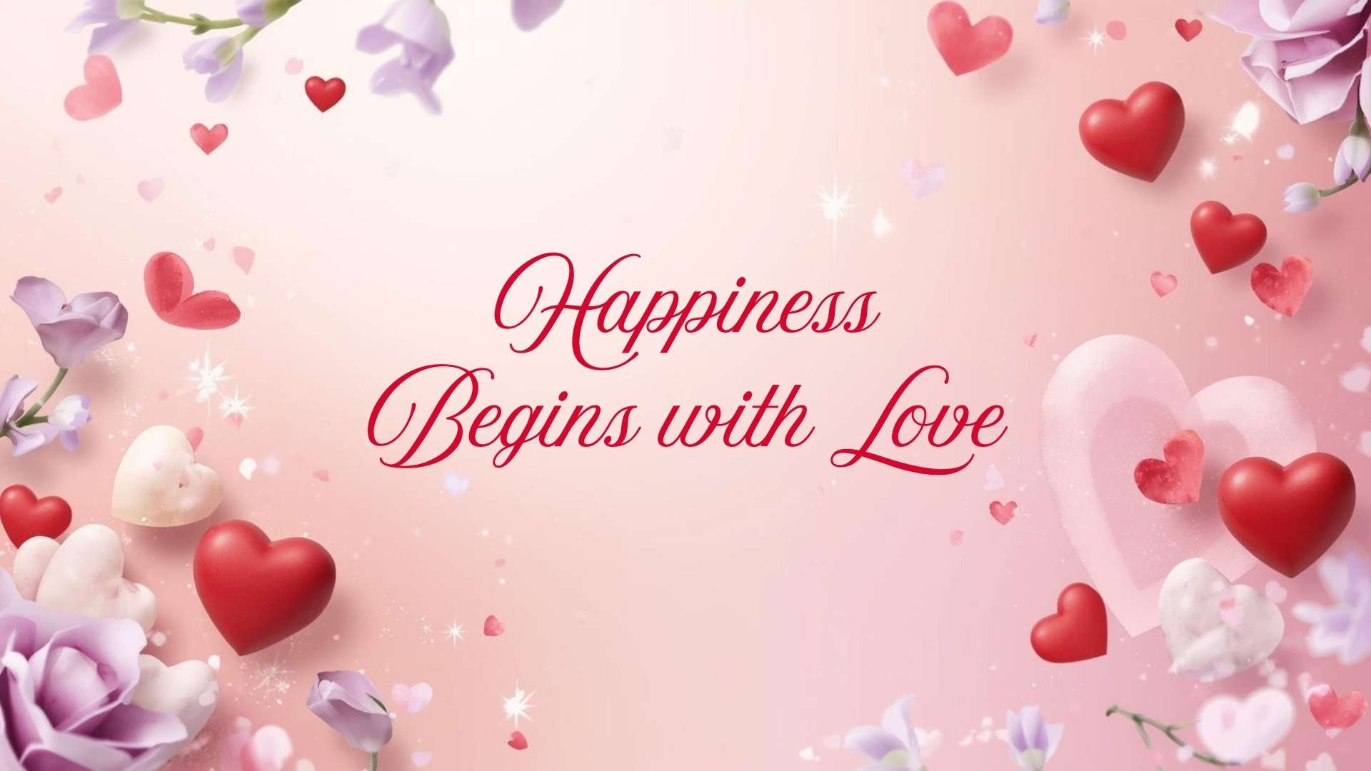 This Elegant Valentine’s Day wallpaper with a love quote features a background of beautiful hearts and flowers, along with the romantic quote “Happiness begins with love.” The graceful design creates a warm and charming atmosphere, perfect for celebrating love.