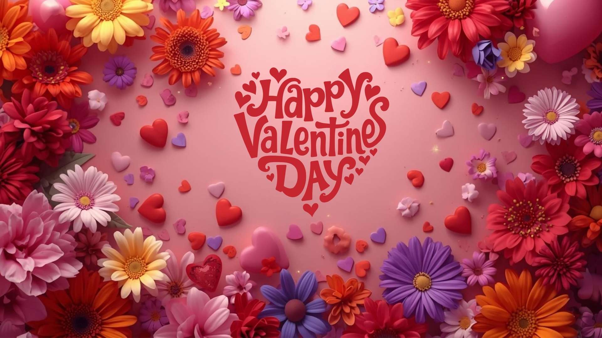 This Heart-Themed Valentine’s Day wallpaper features a vibrant background filled with colorful flowers and hearts, with “Happy Valentine’s Day” written in a stylish font. The cheerful and romantic design makes it perfect for celebrating love.