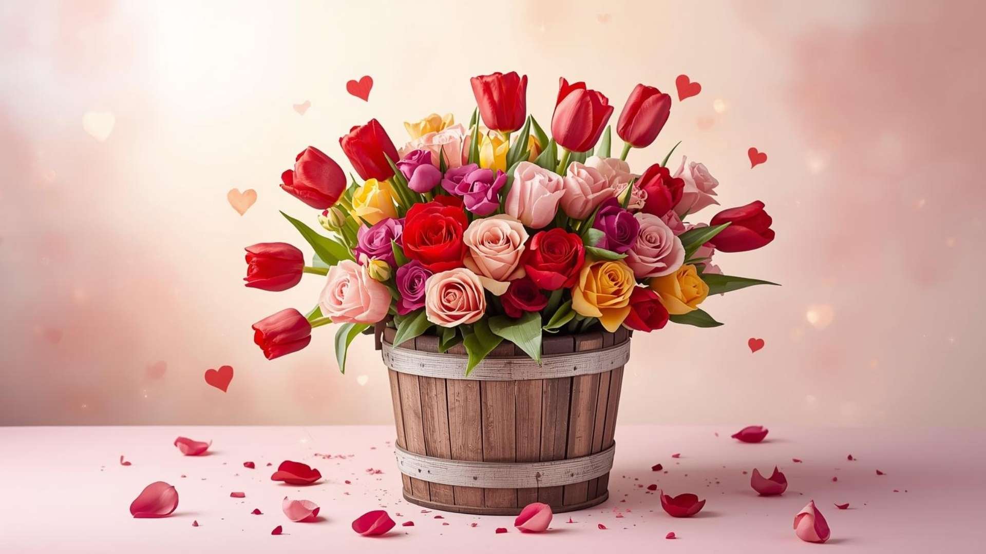 Happy Valentines Day Wallpaper with Flowers, Valentines Day Floral Wallpaper, Flower Bucket Valentine Wallpaper, Roses and Tulips Valentine Wallpaper, Colorful Flower Valentine Wallpaper, Romantic Floral Valentine Wallpaper, Cheerful Valentine Wallpaper,