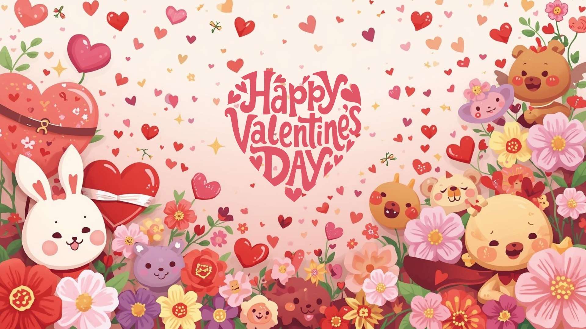 This Happy Valentine’s Day wallpaper features a variety of cute characters, including bunnies and bears, surrounded by flowers and hearts. “Happy Valentine’s Day” is written in a stylish font at the center, creating a playful, charming, and festive design perfect for celebrating love.