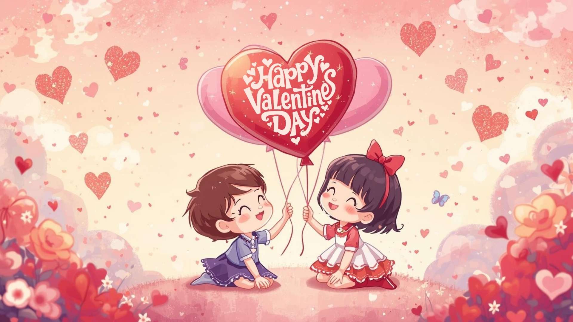 This Happy Valentine’s Day playful wallpaper features a magical background of floating hearts and flowers, with two kids sitting in the center holding red and pink balloons. “Happy Valentine’s Day” is written on the red balloon in a stylish font, creating a sweet, cheerful, and festive design perfect for the occasion.