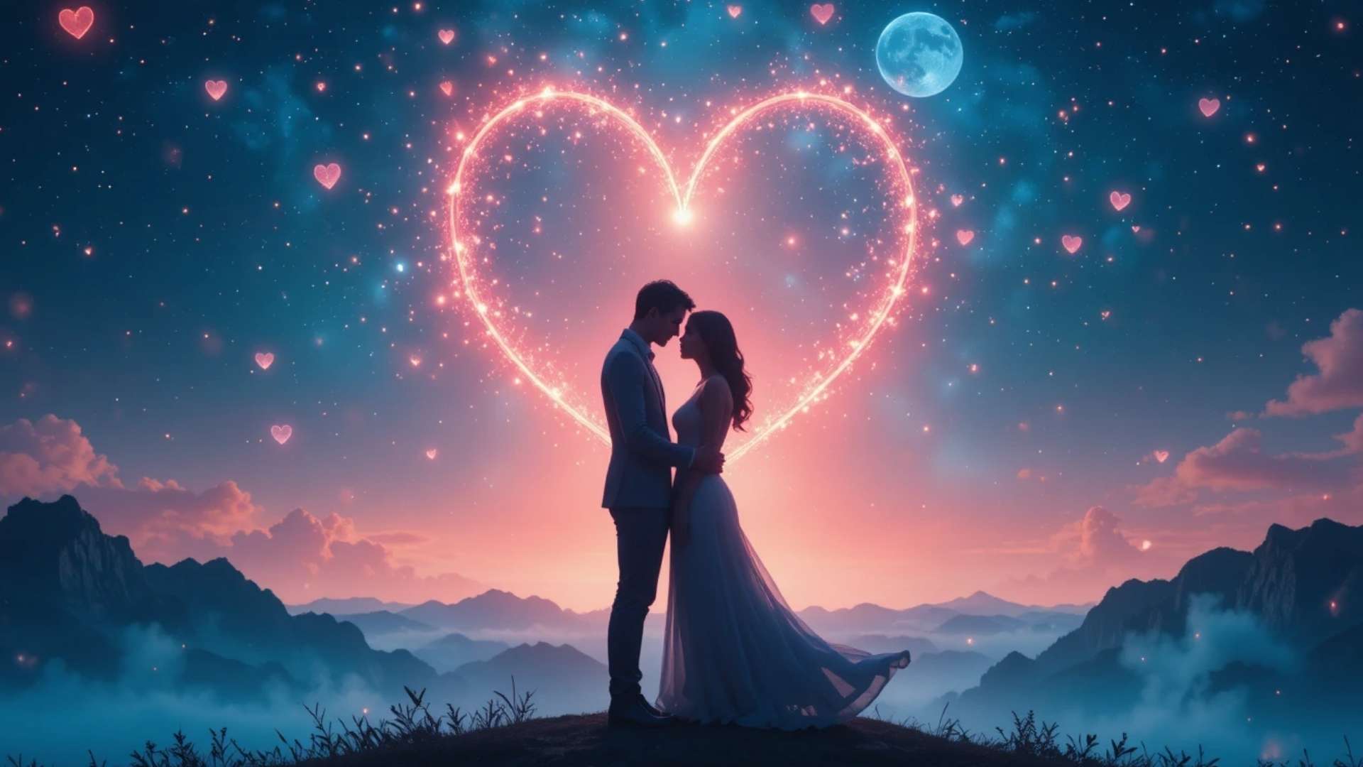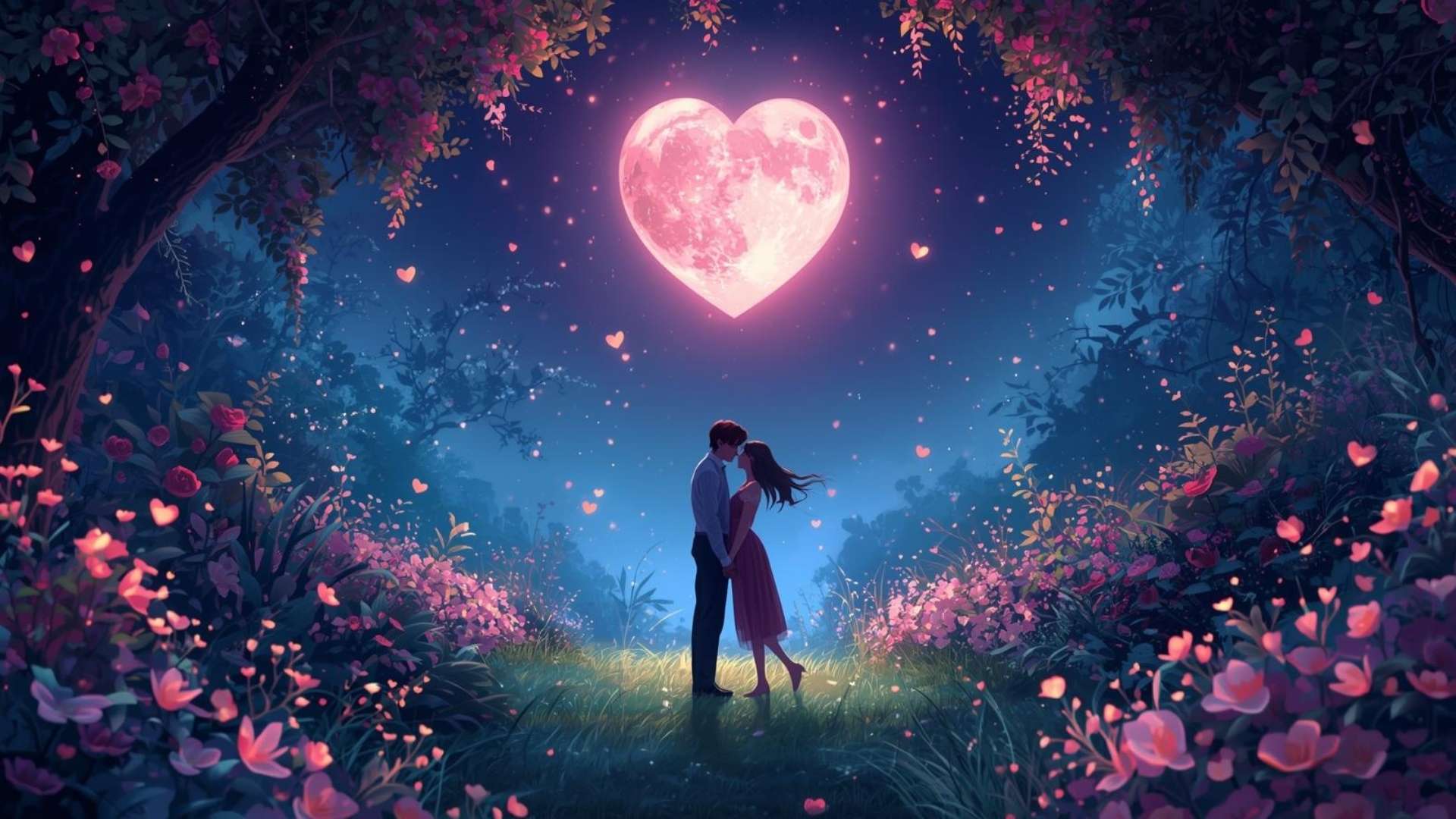 This Lovely Couple Valentine’s Day background depicts a beautiful couple embracing, surrounded by vibrant flowers, with a heart-shaped moon glowing above them in a serene night sky. The romantic scene creates a dreamy and affectionate atmosphere, perfect for Valentine’s Day.