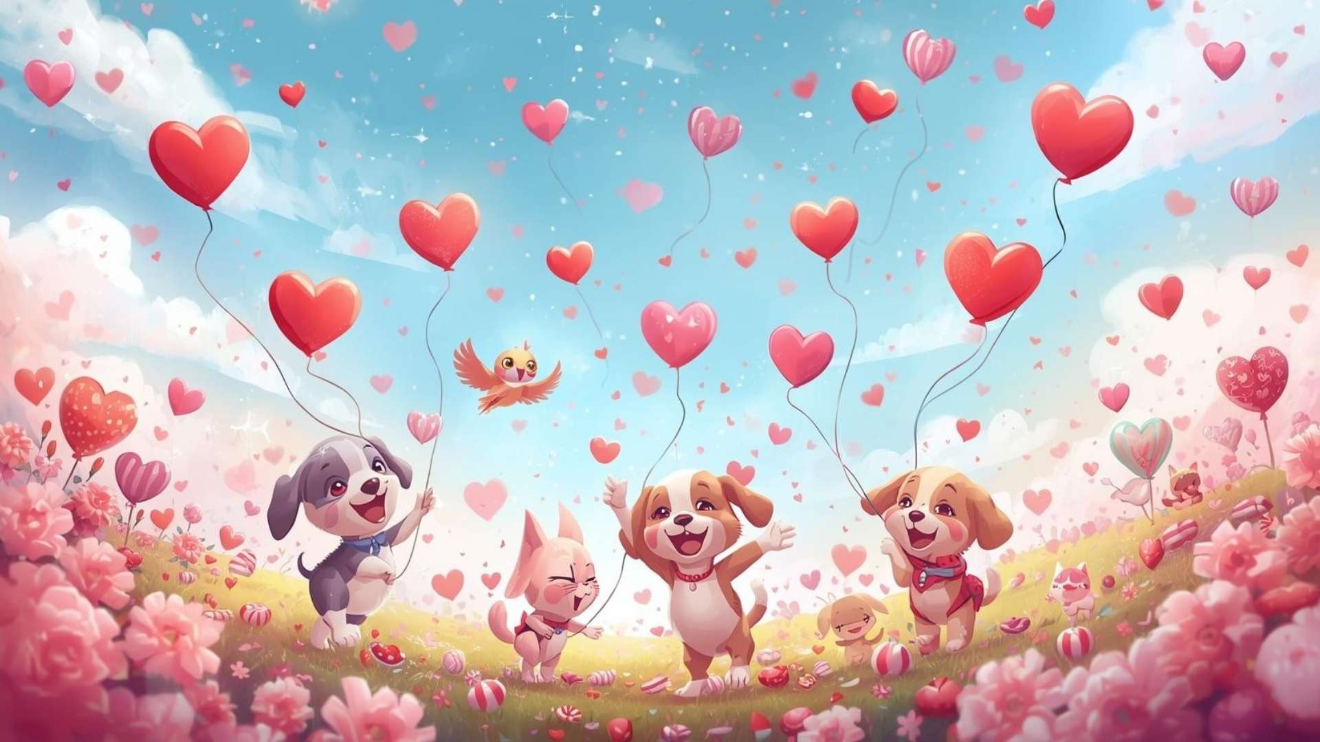 This Playful Happy Valentine’s Day wallpaper features adorable, cheerful dogs holding red heart-shaped balloons, set in a vibrant field full of flowers. The fun and lively design creates a joyful and heartwarming Valentine’s Day atmosphere.