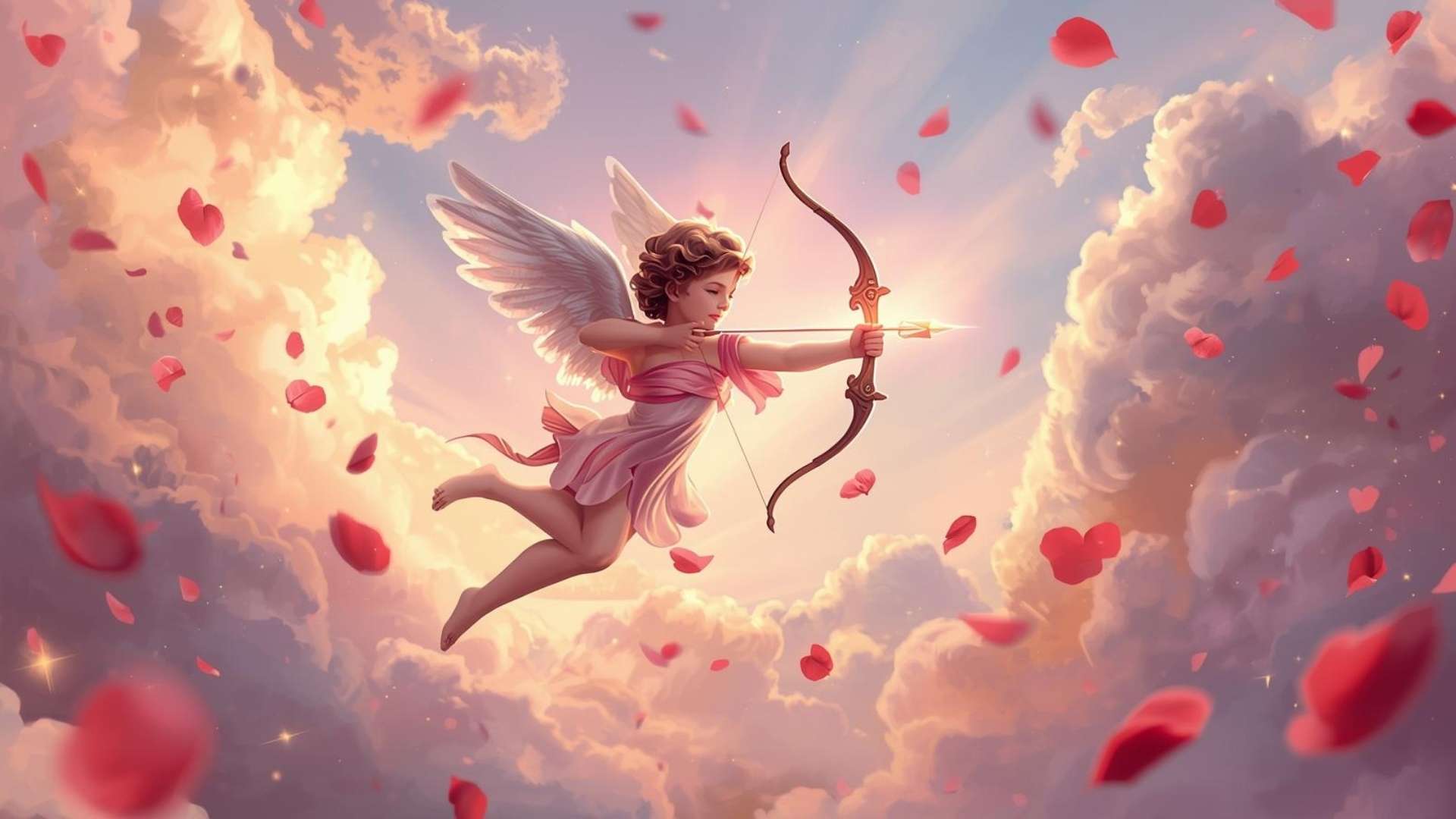 This Valentine’s Day wallpaper for screens features beautiful clouds and rose petals floating gracefully, creating a dreamy atmosphere. A cupid aiming in the air adds a classic romantic touch, making the design feel magical and perfect for celebrating love.