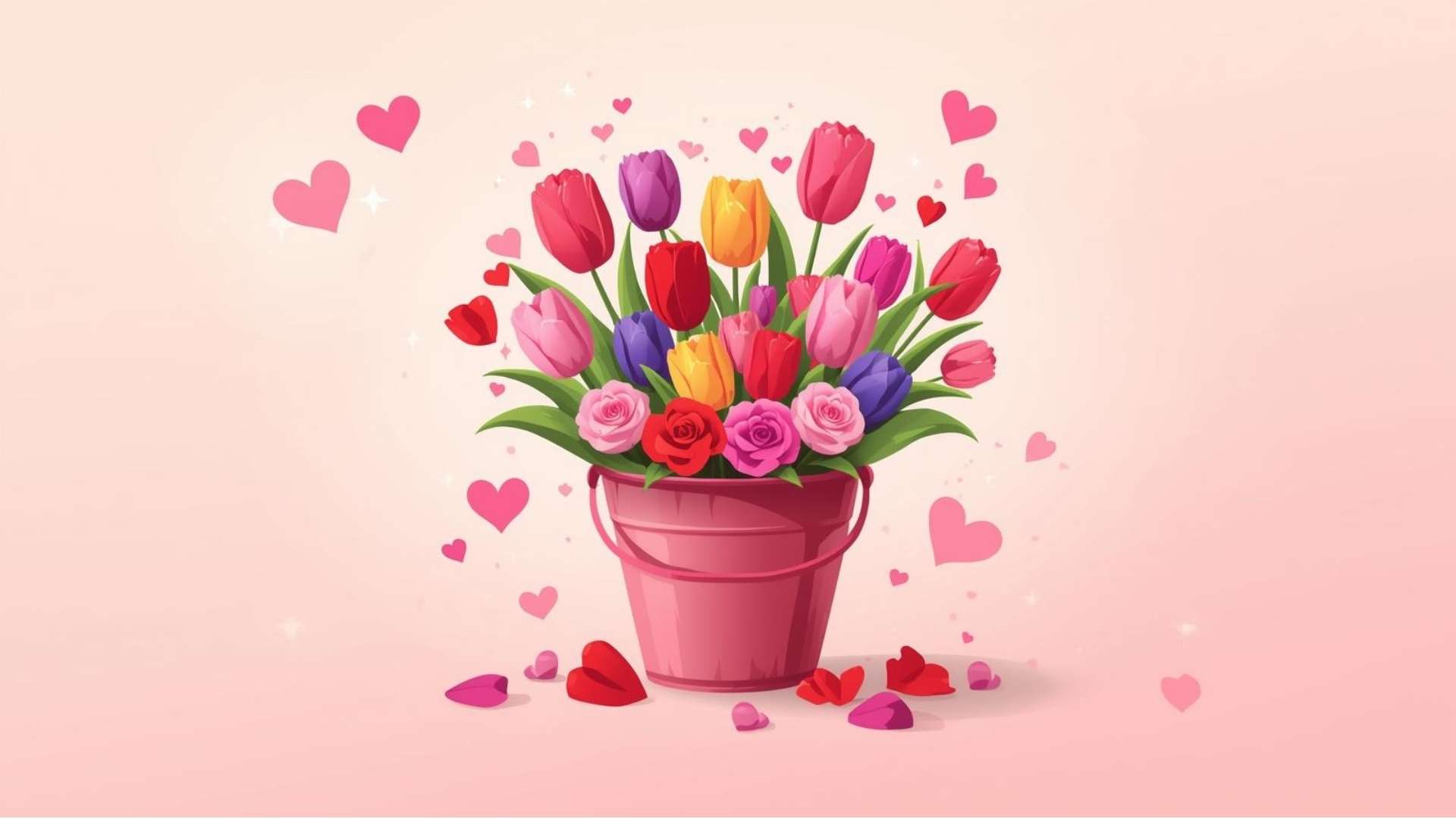 Valentines Day Wallpaper with Flower Bucket, Flower Bucket Valentine Wallpaper, Multicolored Tulips and Roses Wallpaper, Hearts and Flowers Valentine Wallpaper, Colorful Flower Bucket Valentine Wallpaper, Romantic Floral Valentine Wallpaper, Cheerful Happy Valentine Wallpaper, Vibrant Valentine Wallpaper, Love Themed Happy Valentines Wallpaper, Happy Valentines Celebration Wallpaper, Happy Valentines Desktop Wallpaper, Happy Valentines computer Wallpaper
