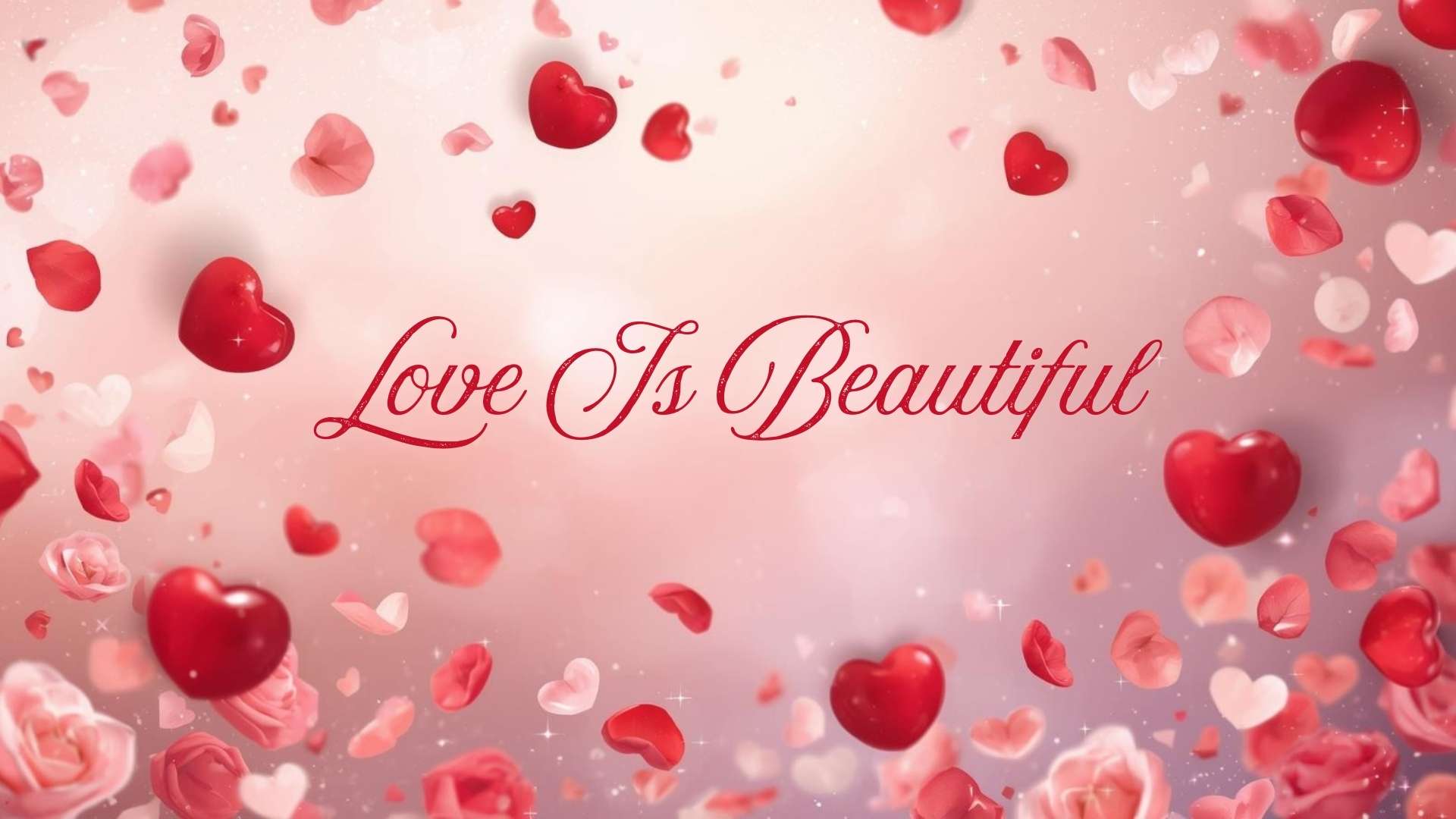 This Valentine’s Day wallpaper with a love saying features a beautiful background of red and pink hearts, along with the romantic quote “Love is Beautiful.” The vibrant and charming design creates a sweet and heartfelt atmosphere, perfect for celebrating love.