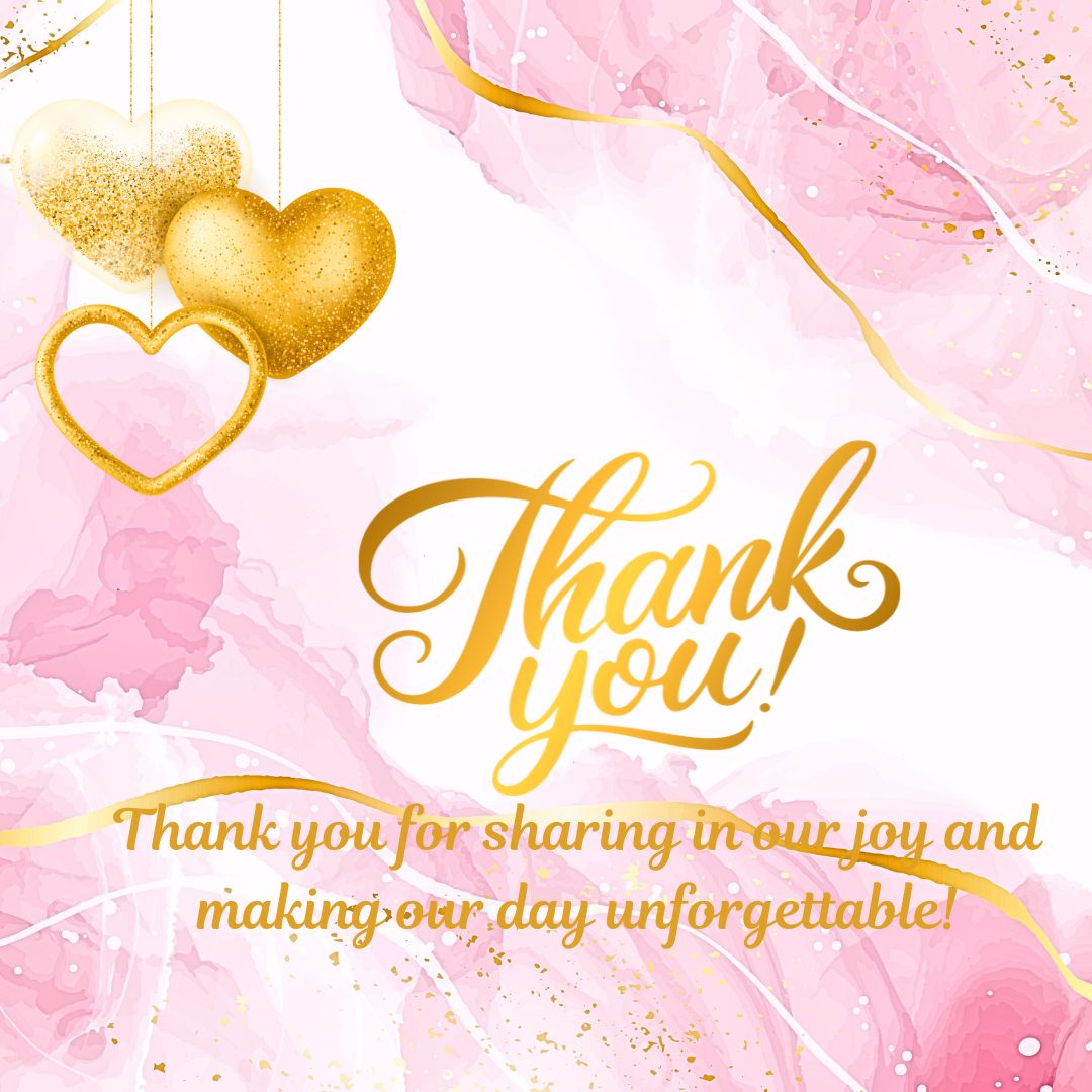 This Abstract Wedding Thank You Card features a modern and stylish design with elegant golden heart hangings that add a touch of charm and celebration. Set against a soft pink and white shaded abstract background, the card perfectly blends contemporary aesthetics with romantic tones. At the center, a warm and graceful message reads: “Thank you for sharing in our joy and making our day unforgettable!”—a simple yet heartfelt note of appreciation. Ideal for couples who love modern design with a hint of glamour, this card beautifully captures the essence of gratitude and love.