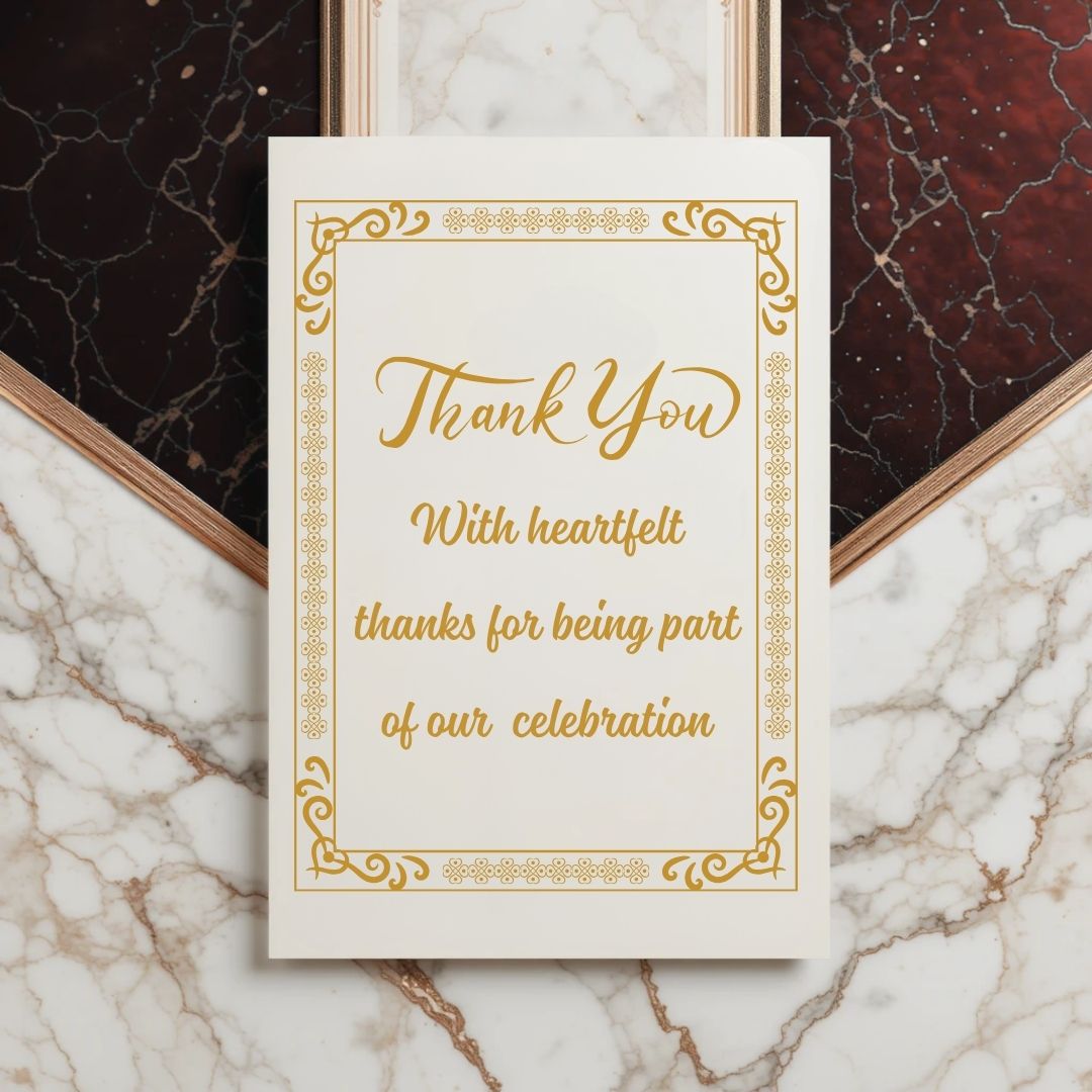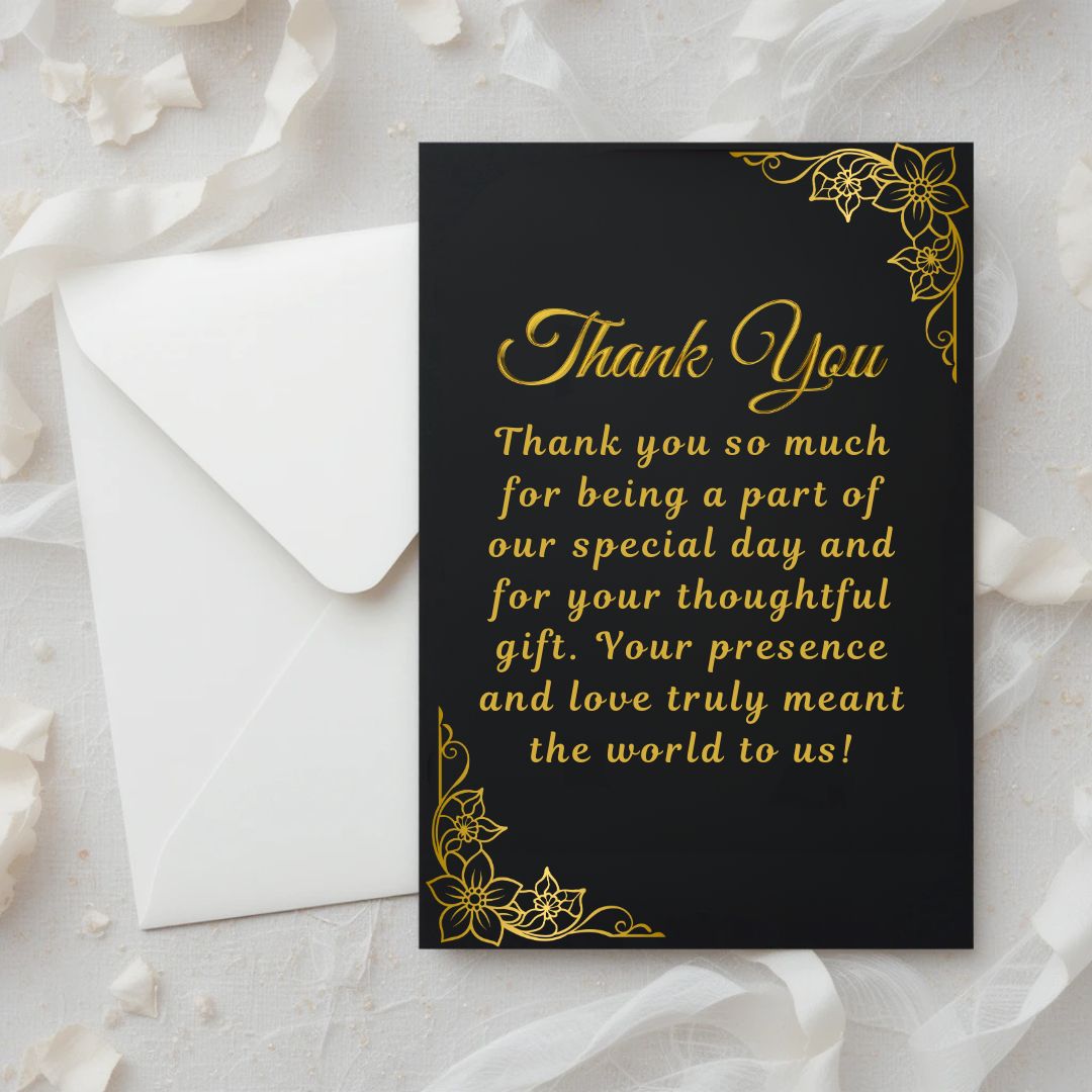 This Classic Wedding Thank You Card beautifully blends timeless elegance with heartfelt emotion. The design features the image of a traditional letter in the background, evoking the charm of handwritten notes, while the main card stands out with a rich black backdrop accented by intricate golden floral grill designs in two corners. A bold golden “Thank You” sits prominently at the center, accompanied by a touching message: “Thank you so much for being a part of our special day and for your thoughtful gift. Your presence and love truly meant the world to us!” Perfect for couples who value tradition and sophistication, this card is a graceful way to express genuine appreciation.