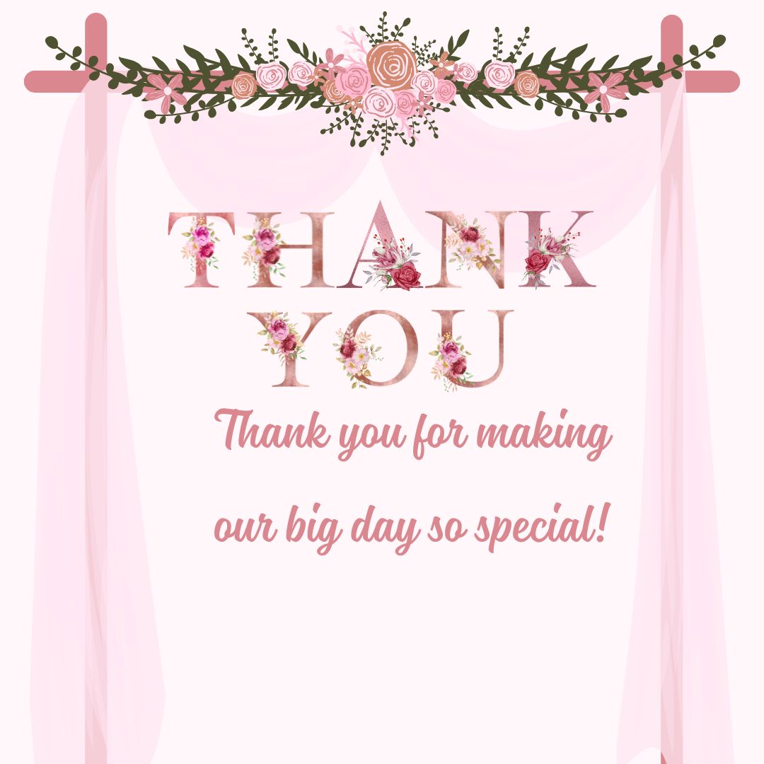 This Minimalist Wedding Thank You Card combines simplicity with elegance, featuring a soft and graceful design of wedding curtains adorned with delicate flowers. The “Thank You” text is creatively styled using beautiful floral-themed characters, adding a subtle artistic touch without overwhelming the minimalist layout. Beneath it, a heartfelt message reads: “Thank you for making our big day so special!” Perfect for couples who appreciate clean, elegant aesthetics, this card offers a warm and stylish way to express gratitude while keeping the design refined and meaningful.