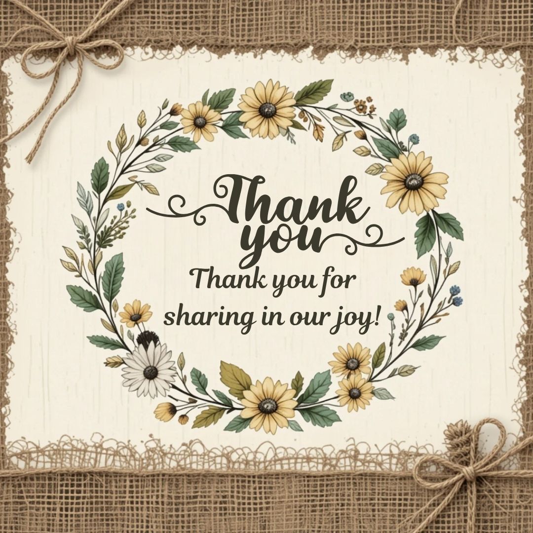 This Rustic Wedding Thank You Card captures the charm of countryside elegance with its unique design featuring a delicate circle of embroidered flowers set on a fabric-like background, giving it a cozy, handcrafted feel. At the center of the floral embroidery is a bold “Thank You,” accompanied by the heartfelt message: “Thank you for sharing in our joy!” Perfect for rustic, boho, or nature-inspired weddings, this card beautifully conveys gratitude with warmth, simplicity, and a touch of vintage charm.