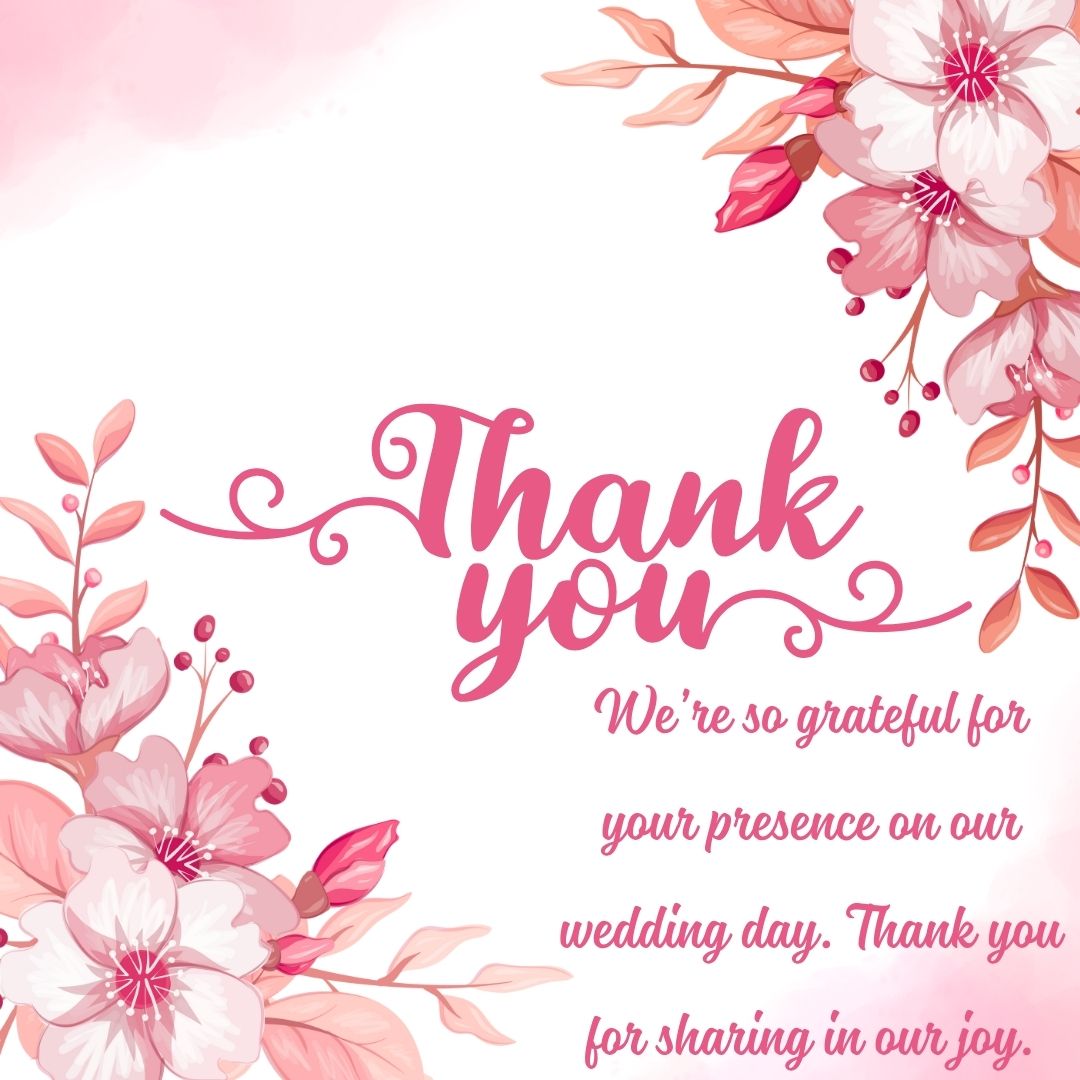 Download this Romantic Floral Wedding Thank You Card for free in both PDF and JPG formats, perfect for printing or sharing digitally. This charming card features soft pink-shaded floral illustrations delicately placed in each corner, creating a romantic and elegant frame around the center text. A bold “Thank You” stands out beautifully, accompanied by a heartfelt message: “We’re so thankful for your presence and love!” This design is ideal for couples who want to express their appreciation with warmth and floral beauty, making every thank-you note feel extra special.